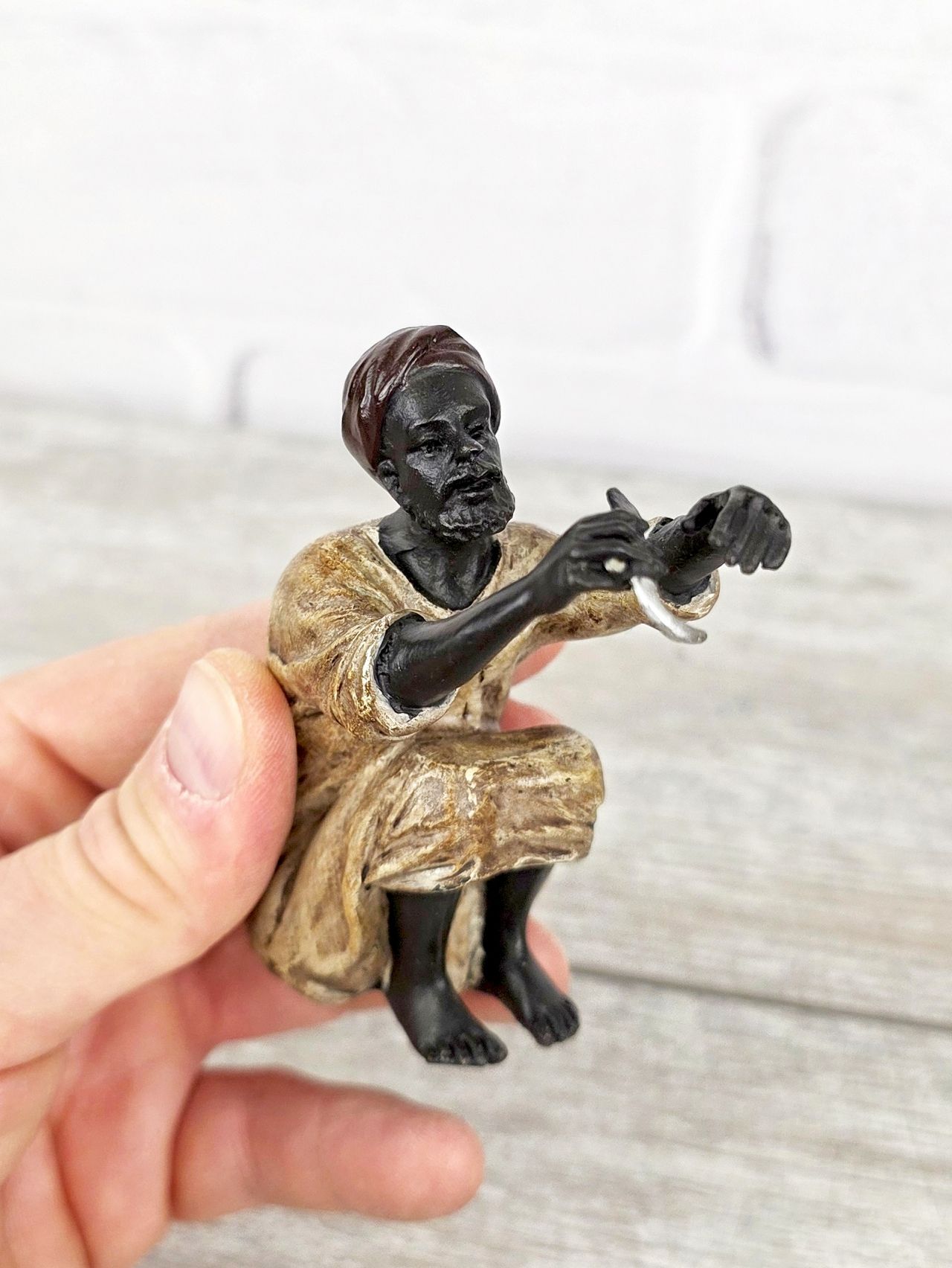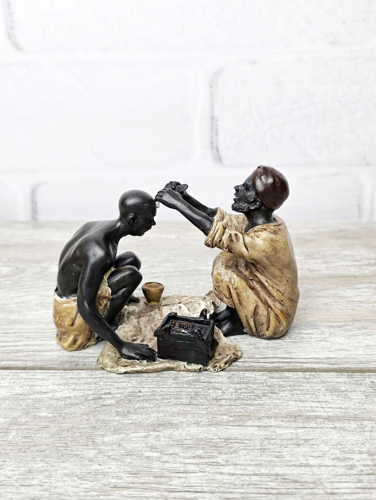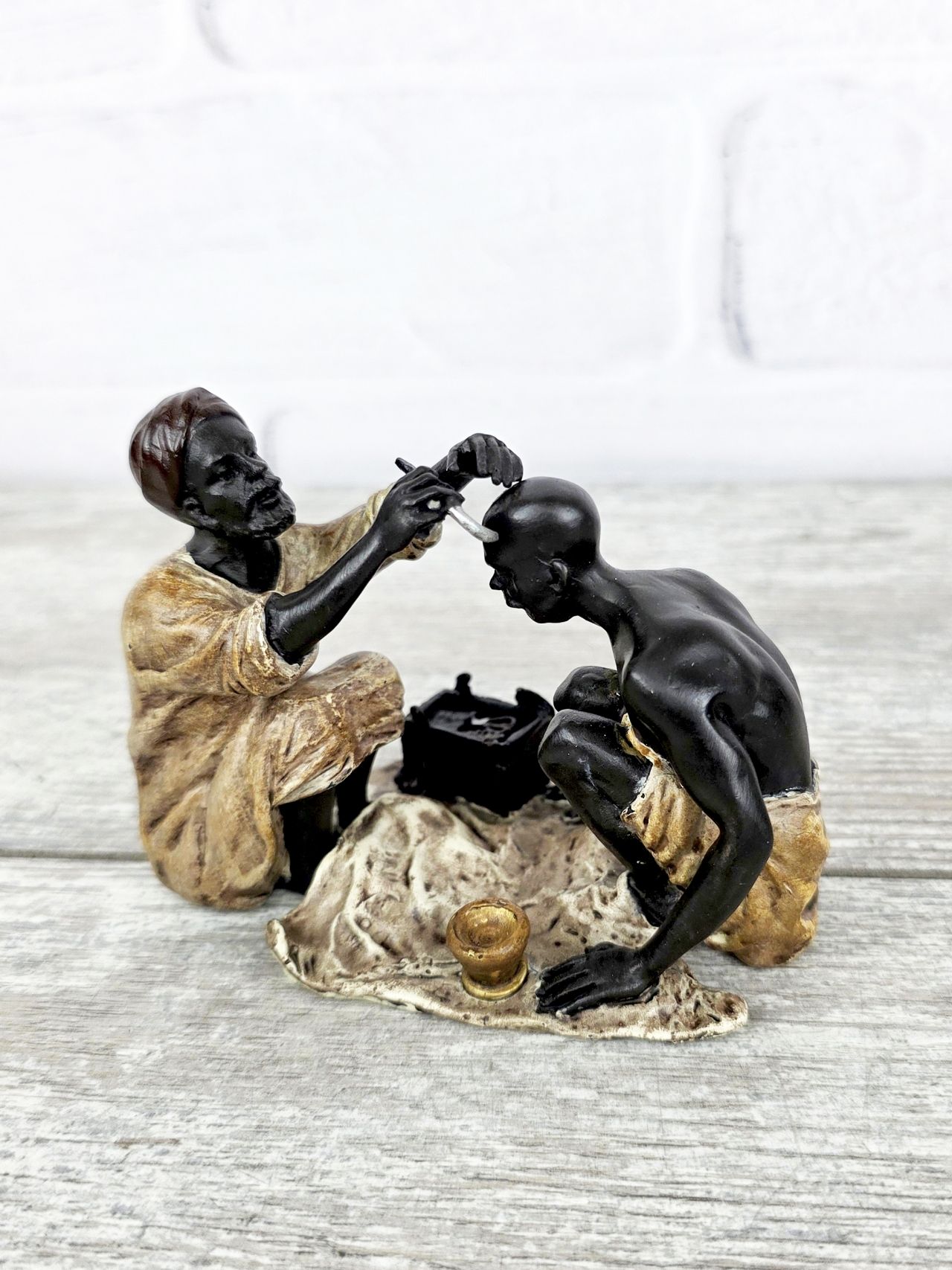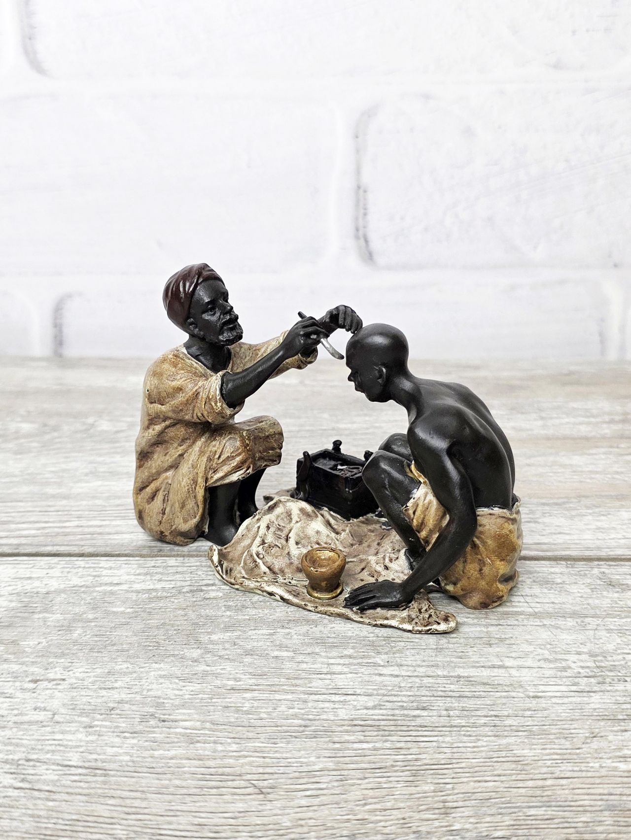 Представленная работа является характерным образцом венской декоративной бронзы начала XX века. Фигурка изображает сцену в арабской парикмахерской: цирюльник бреет голову мужчине.