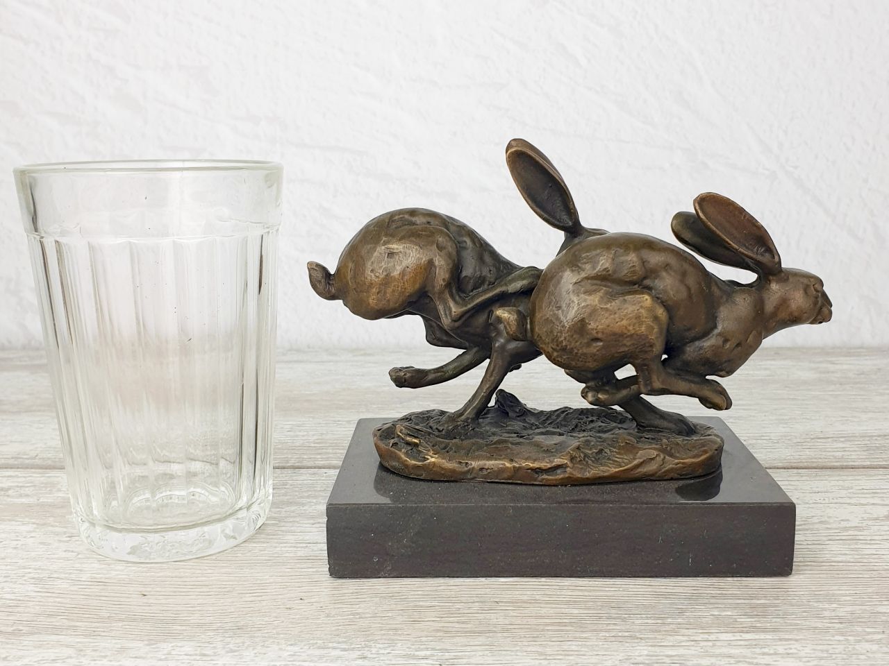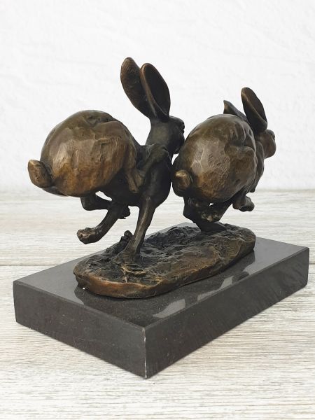 Авторская работа европейского скульптора, изображающая удирающих во всю прыть зайцев. Автор мастерски передаёт динамику момента бега, характерное положение лап, напряжение мышц. Отличный подарок охотникам.