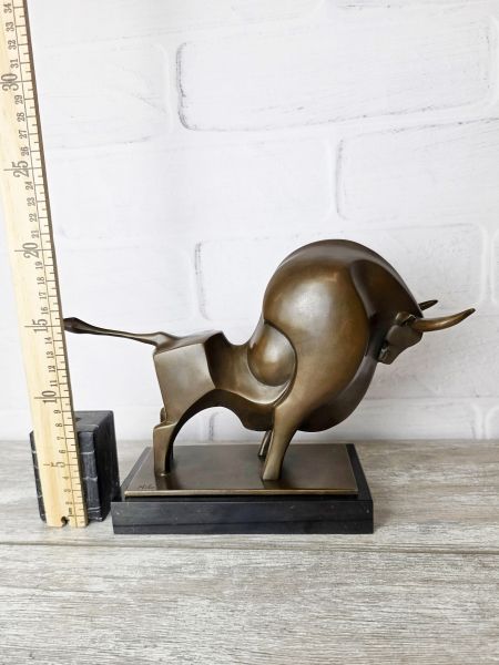 Средних размеров (20х30см; 4кг), авторская работа, изображающая быка. Выполнена в абстрактном современном стиле, вдохновленном кубизмом, с использованием угловатых форм и плавных изгибов.