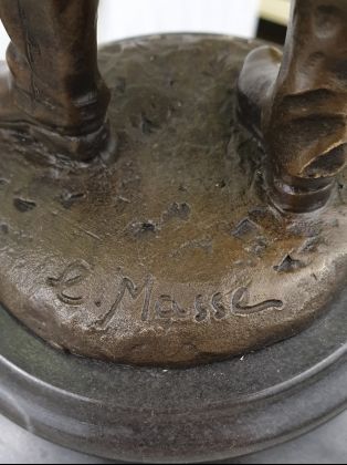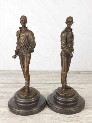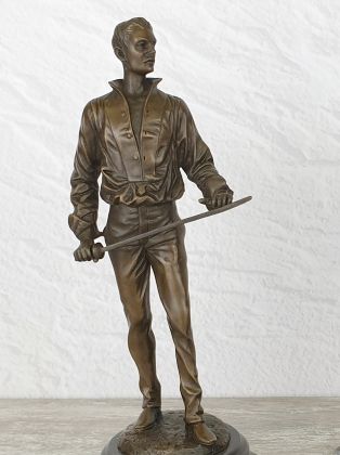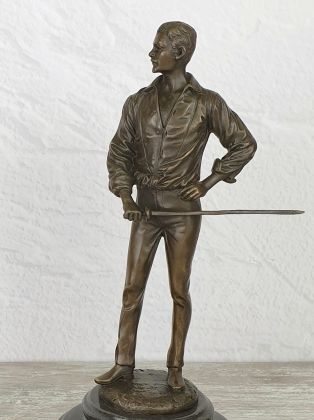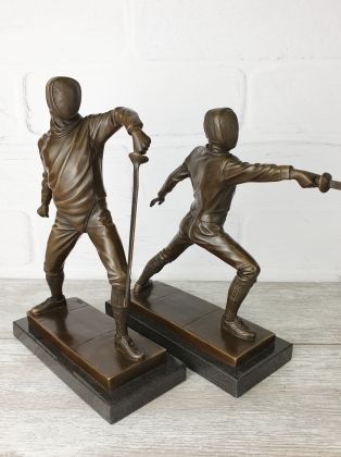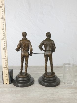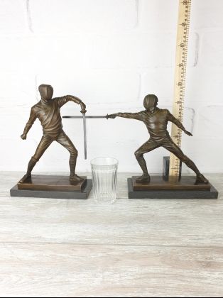 Парные скульптуры "Дело чести". Модель начала XX века. Вес указан общий. Размеры указаны одного дуэлянта. Автор модели - талантливый французский скульптор Рене Шарль Массе (Rene Charles Masse, 1898-1913). Скульптор запечатлел момент начала аристократического поединка чести. Такие дуэли с использованием холодного оружия происходили по определённым правилам и имели целью восстановление чести, достоинства, а в некоторых случаях - разрешение спора. Как правило, дуэли происходили только внутри отдельных социальных слоёв, и ассоциировались с аристократией. Скульптуры выполнены из бронзы, литьё исполнено по тщательно подготовленной форме, позволившей точно воспроизвести авторскую моделировку.