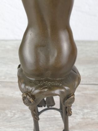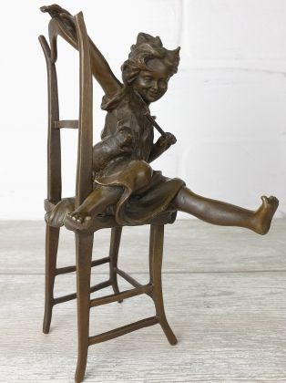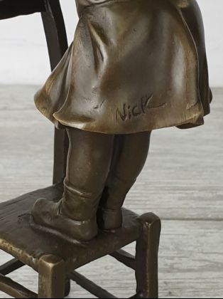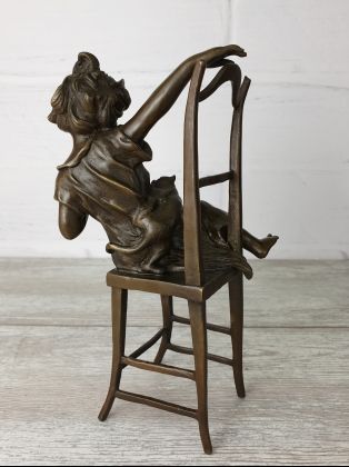 Авторская работа европейского скульптора из серии работ с изображением "девушек на стуле". Автор изобразил очаровательную девушку в соблазнительной одежде, скорее подчёркивающей, нежели скрывающей её формы. Обратите внимание на шикарное, резное кресло на котором сидит девушка.