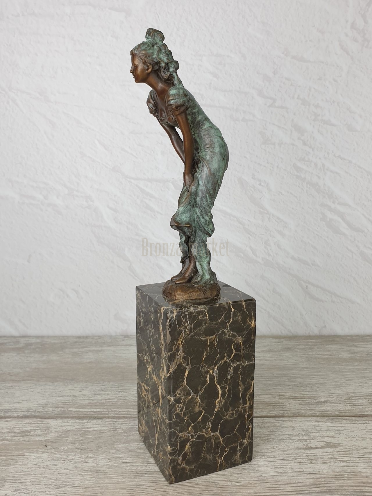Представляем небольшую,но очень стильную работу европейского скульптора. Тело девушки совершенно, а поза невероятно изящна и сексуальна. Особое внимание автор уделил лицу девушки, оно притягивает своим обаянием...загадочное, удивительно красивое. Платье, на которой прописана каждая складочка, как и волосы покрыты зелёной патиной. Статуэтка наполнена изяществом, гламуром, утончённостью.