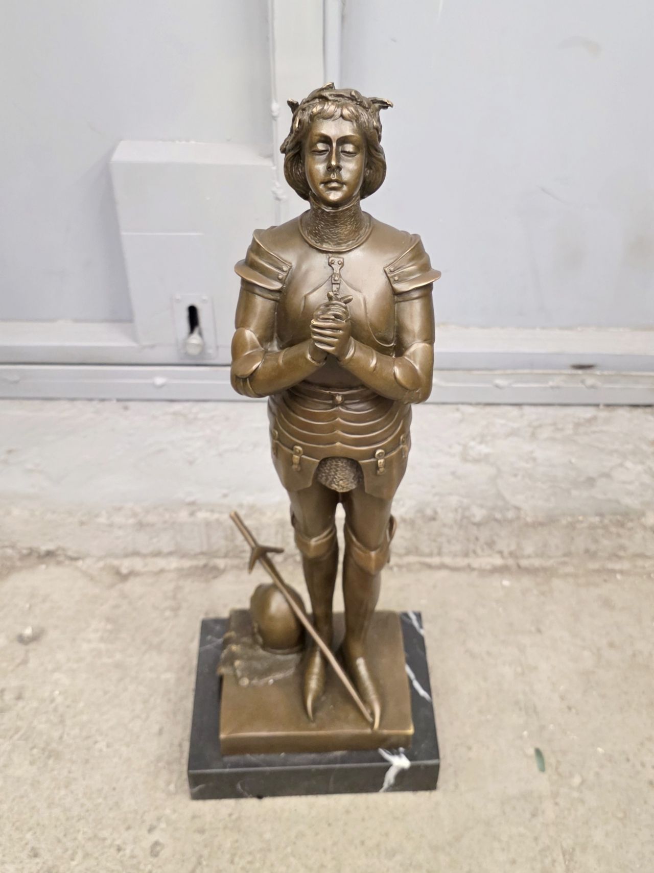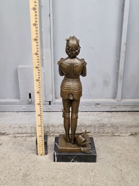 Представленная бронзовая статуэтка Жанны д' Арк является репродукцией известной скульптуры, созданной французским мастером Антоненом Мерсье.