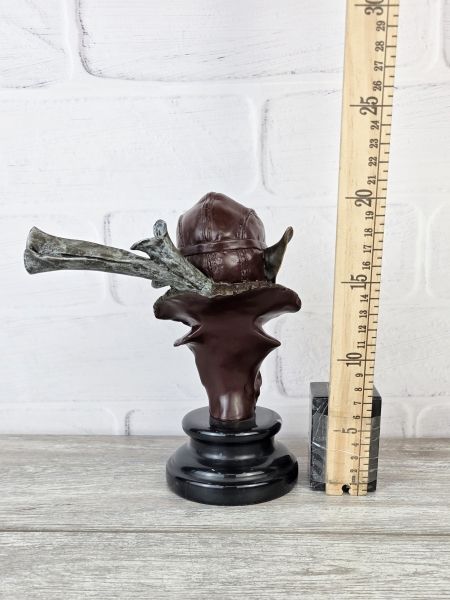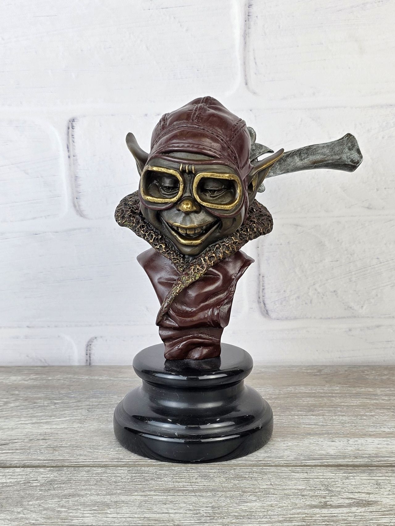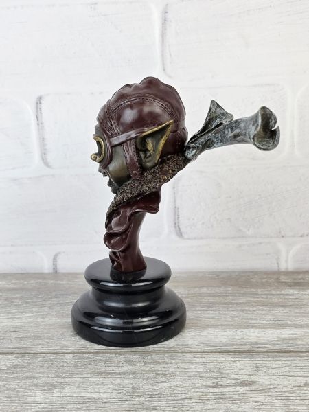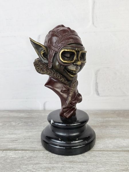 Автор изображает гоблина Берти, потерпевшего крушение пилота, – забавную декоративную статуэтку из бронзы. Детализированная структура поверхности оживляет маленького гнома, а кожаный шлем и авиационные очки создают впечатление, что это комичное мифическое существо готово к новым приключениям. Статуэтка установлена на скромном мраморном основании, а искусная ручная роспись придает ей винтажный вид.