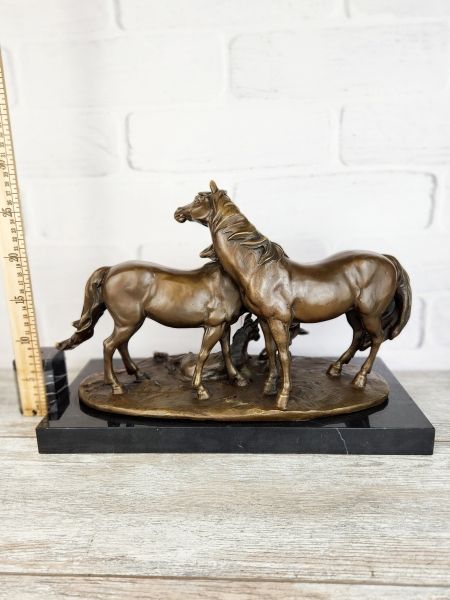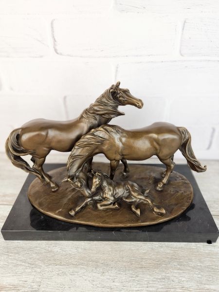 Крупнaя (41см ширина; 14,6кг), интерьерная работа, изображающая семью лошадей. Качество отменное. В мельчайших подробностях передана анатомия животных, характерный рельеф мускулатуры.