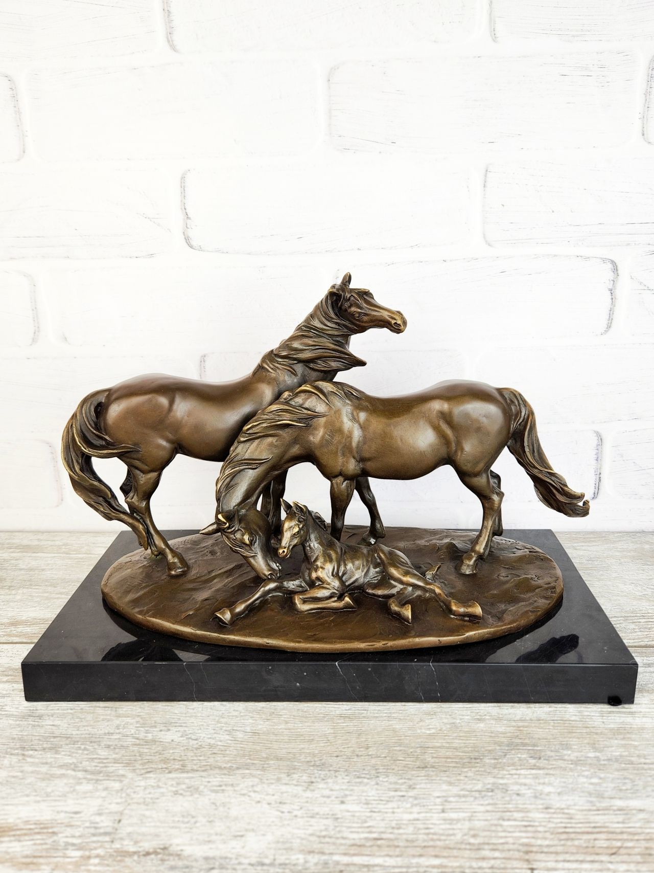 Крупнaя (41см ширина; 14,6кг), интерьерная работа, изображающая семью лошадей. Качество отменное. В мельчайших подробностях передана анатомия животных, характерный рельеф мускулатуры.