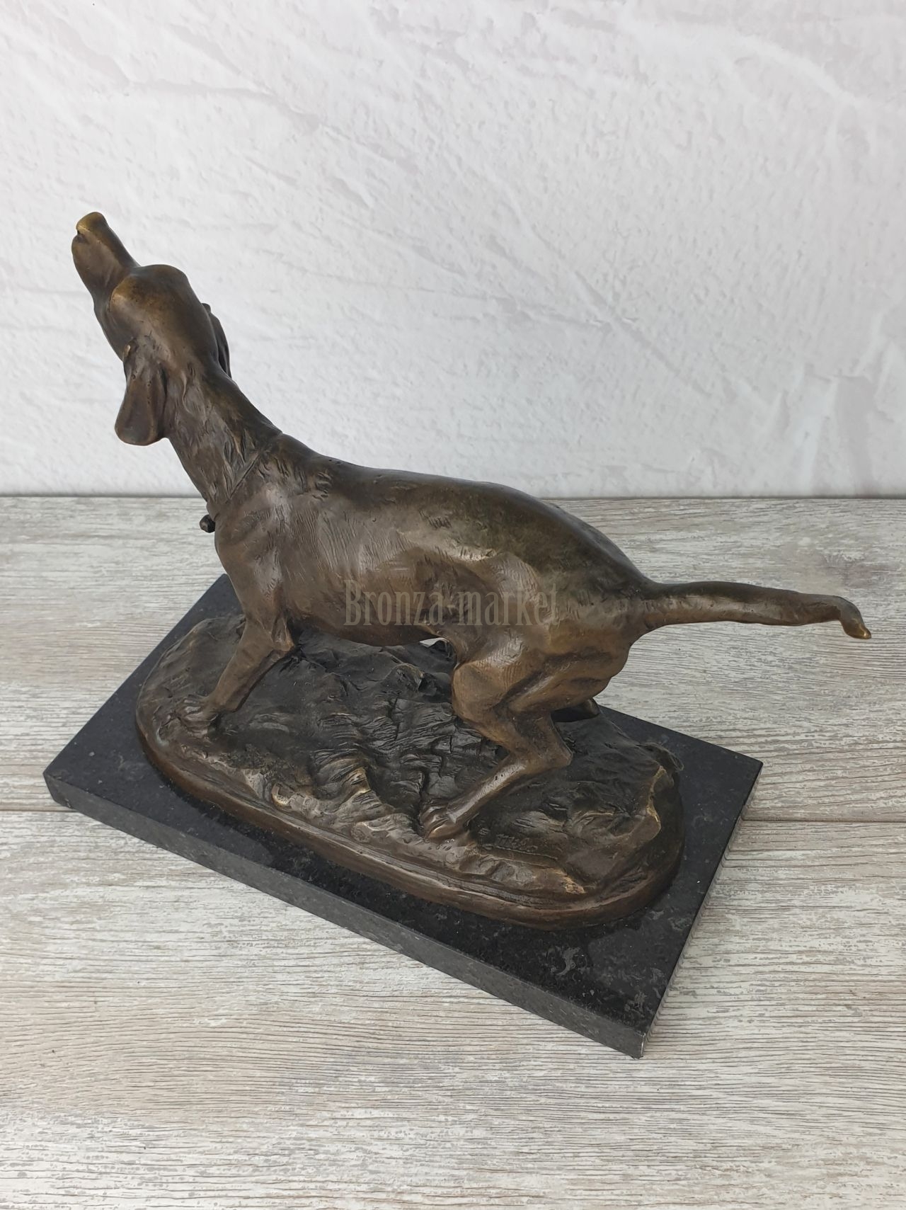 Представляем авторскую скульптуру, изображающую гончую собаку перед прыжком. Скульптура, исполненная на высочайшем уровне, в мельчайших подробностях передает анатомию тела животного, характерный рельеф мускулатуры, особенности морды и даже выражение глаз. Также хочется отметить выразительную позу собачки, придающую скульптуре особую привлекательность.