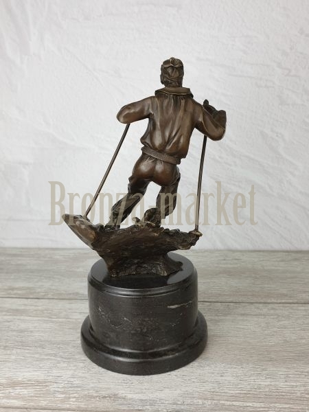 Качественная работа европейского скульптора, изображающая горнолыжника. Автор умело передаёт динамику момента прохождения спуска, поза горнолыжника естественна, реалистична. Обращает на себя внимание предельное внимание к каждому сантиметру работы, в мельчайших подробностях переданы детали одежды и обмундирования спортсмена.