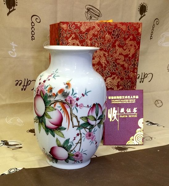 Достаточно крупная ваза, но не напольная, расписана полностью вручную. Стиль росписи представленной вазы берёт своё начало во времена правления династии Мин(1368-1644). Для данного стиля письма характерны яркие цветочные орнаменты, в большинстве своём дополненные такими же яркими, пёстрыми птицами. В комплекте подарочная коробка, выполненная в традиционном китайском стиле и паспорт с описанием вазы на китайском языке и фоторафией как самой вазы, так и художника, расписавшего её. При выборе ваз мы в первую очередь руководствовались качеством письма, умением мастера тонко прописать мельчашие детали пейзажа, но помимо этого большую важность имеет само качество фарфора, которому мы уделяли не меньшее внимание.