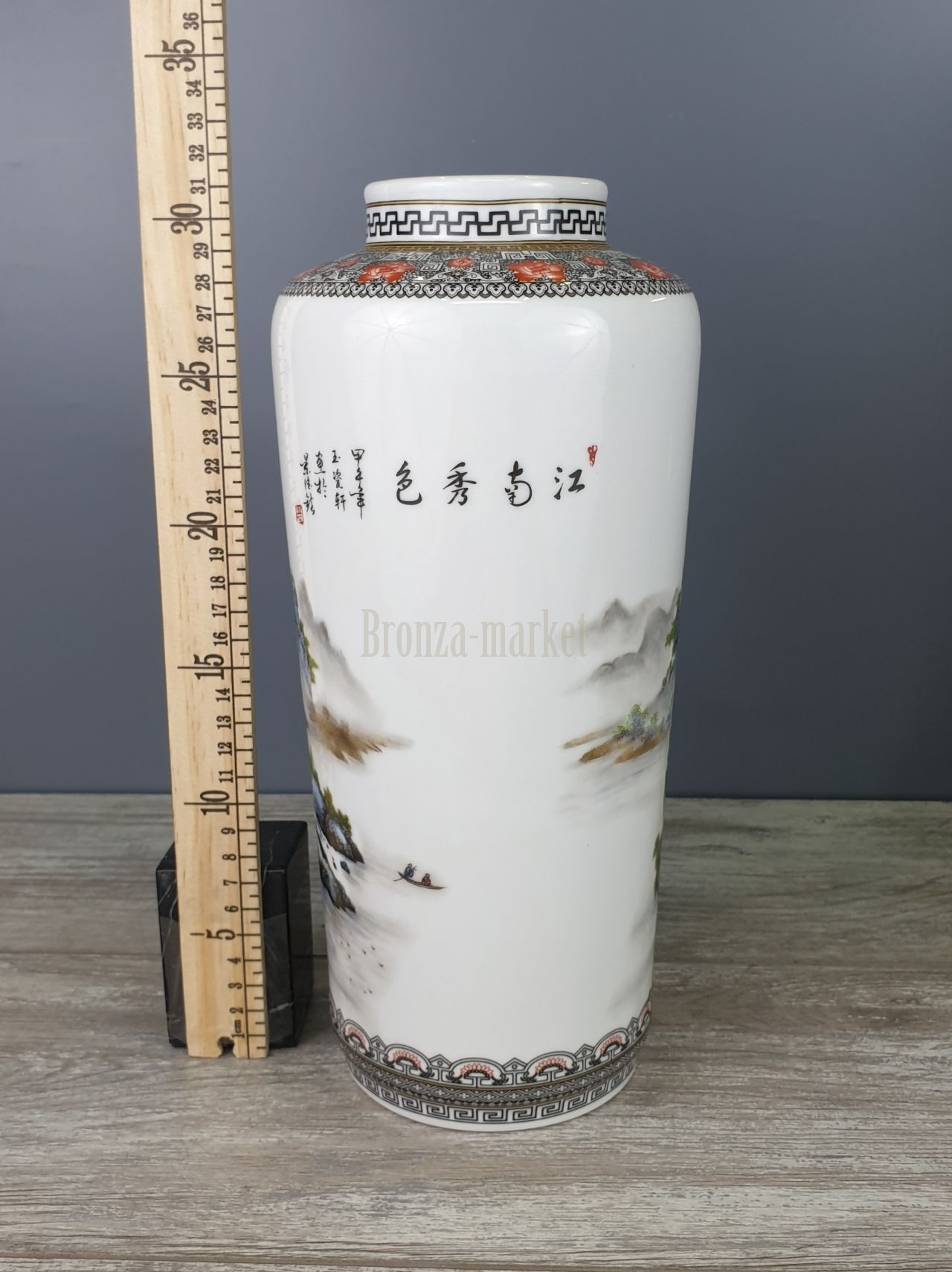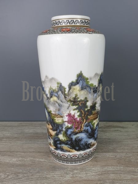 Некрупная (31см) фарфоровая ваза. Стиль росписи представленной вазы относится к последнему периоду правления династии Мин(с 1573г). Тогда особенно ценились пейзажи, выполненные с особым искусством, и обладающий индивидуальностью. В комплекте подарочная коробка и паспорт.