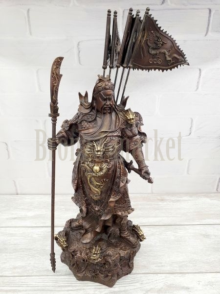 Гуань, величественный и могучий китайский бог войны. По древней легенде, в незапамятные времена жил в Китае великий мастер боевых искусств в совершенстве владевший довольно экзотическим оружием: большим кривым ножом, примотанным к длинному шесту. Подвиги мастера, изящество и быстрота движений потрясали воображение современников, его боевые приёмы стали настолько популярны, что всё больше и больше воинов предпочитали "нож Гуаня" другому холодному оружию. Впоследствии китайцы обожествили Гуаня и поклонялись ему как богу войны. Китайцы почитают его как лучшего защитника дома от воров, грабитилей, убийц и других напастей, а также собственного бизнеса от конкурентов. Кроме того Гуань - покровитель полководцев и военных.