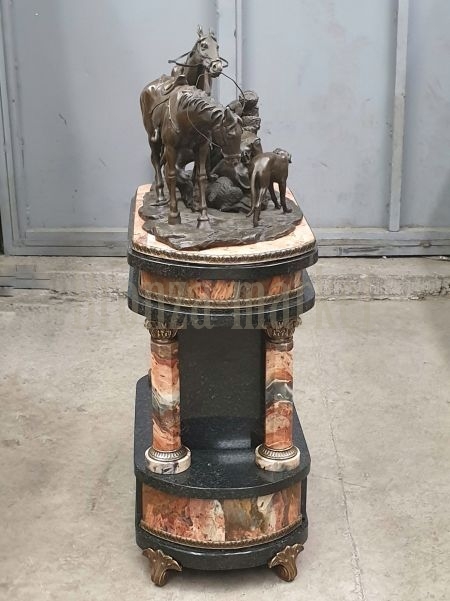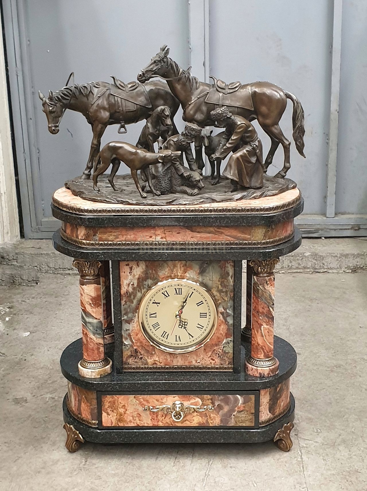 Представляем Вашему вниманию большие, роскошные каминные часы. 68см в высоту и более 50 кг. яшмы и бронзы. Часы очень тяжёлые. Ювелирная работа российских умельцев: камни подбираются со схожим рисунком, здесь очень важна симметрия, затем камни обрабатываются, полируются, подгоняются под нужный размер. Вручную мастерятся декоративные вставки из бронзы или других камней. Каждая деталь каминных часов, будь то основание или колонны, изготавливается отдельно и потом эта сложная конструкция собирается вручную. Венчает всё это великолепие бронзовая скульптура, изображающая сцену охоты на медведя.