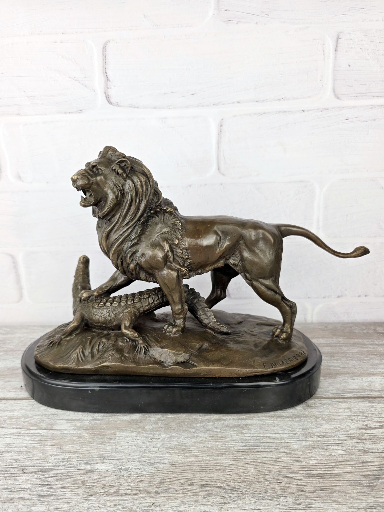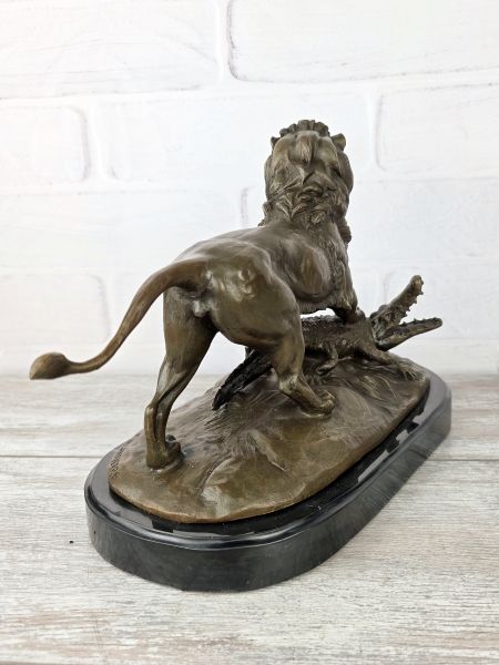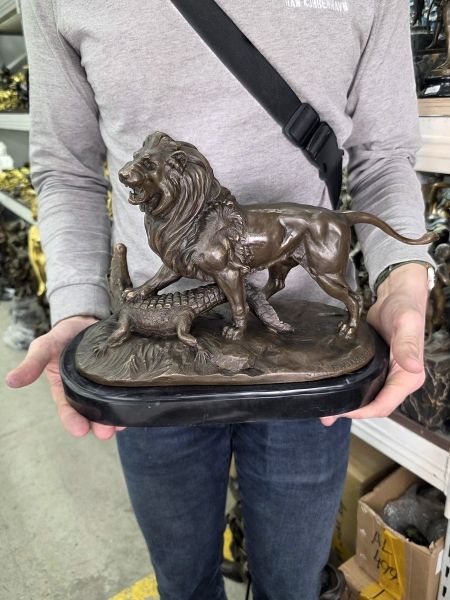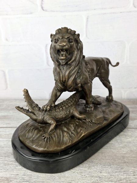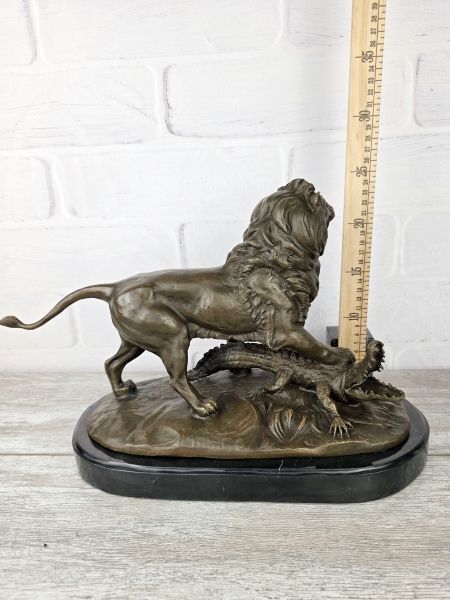 Скульптура немаленькая (33см в ширину; 8,7 кг), изображает драматическую сцену борьбы между львом и крокодилом.