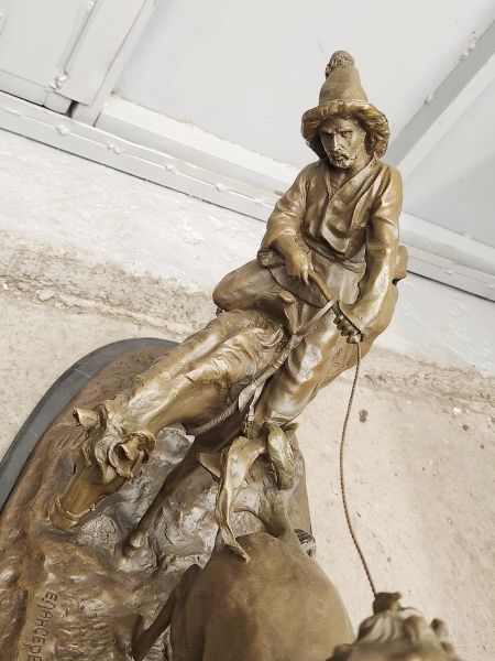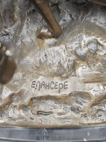 Модель 1878 г., Российская империя, Санкт-Петербург. На поземе подпись скульптора: "Е.ЛАНСЕРЕ". Реплика одной из известнейших работ Е. Лансере.Лансере Евгений Александрович (1848-1886) - сын инженера путей сообщения, происходил из французской семьи, поселившейся в России. Систематизированного художественного образования не получил, лепкой занимался самостоятельно, посещал мастерские скульпторов, в частности Н.И.Либериха, работал с натуры. В 1867 и 1876 гг. совершил поездки в Париж, где изучал художественное литье из бронзы и знакомился с произведениями искусства, находящимися в музеях. Ежегодно путешествовал по средней и южной России, Украине, Кавказу, Башкирии, Киргизии, Крыму. В 1883 году побывал в Алжире.