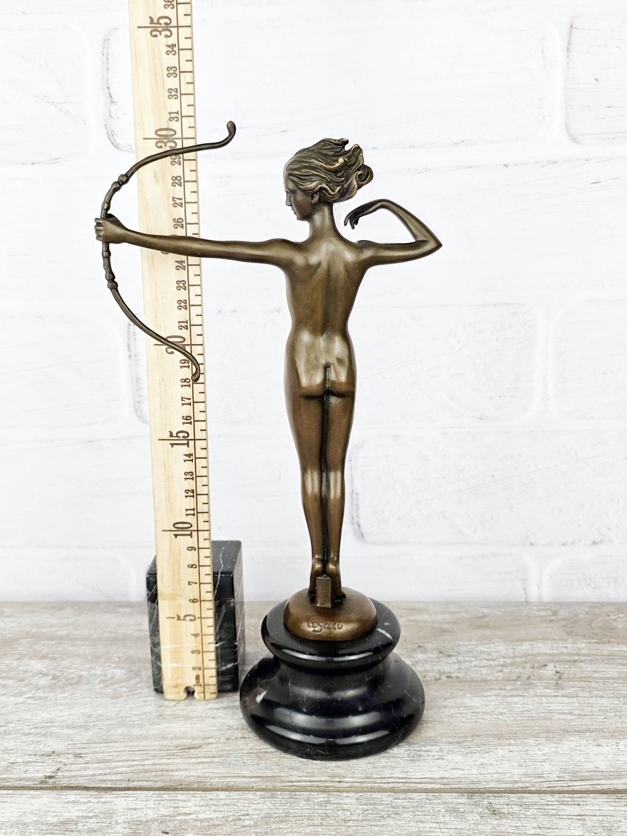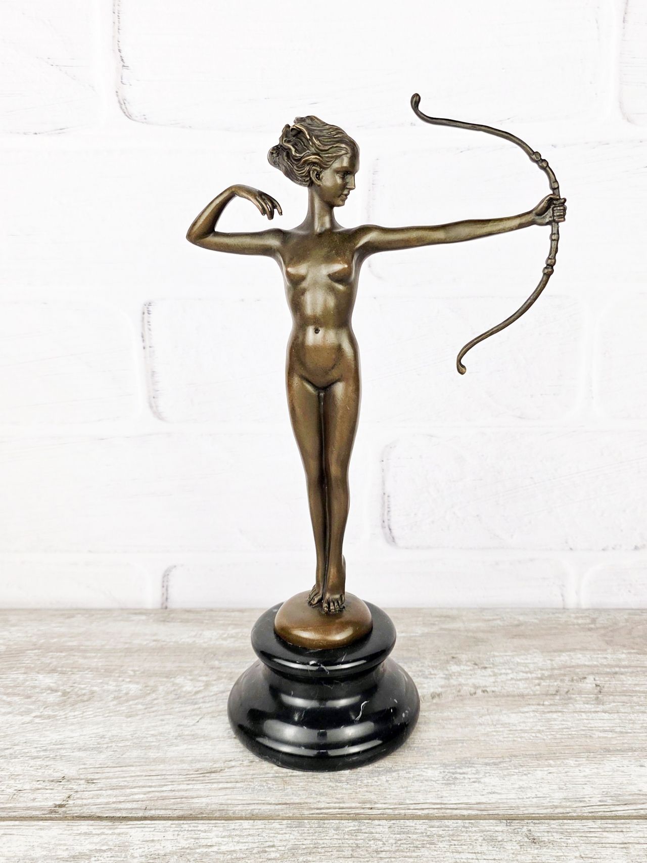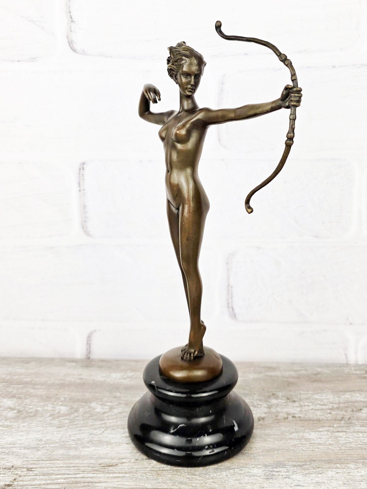 Авторская работа европейского скульптора, изображающая девушку, стреляющую из лука. Автор интересно расчерчивает геометрию фигуры девушки с прямыми углами. Оно словно замерло, готовясь в выстрелу и только ветер колышет её волосы. Также отмечаем холодную красоту и безупречно прописанную анатомию молодого женского тела.