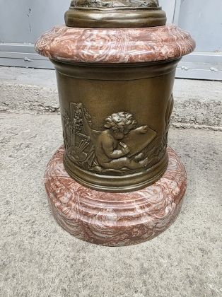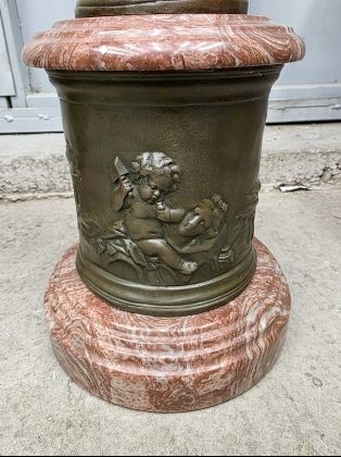 Обе скульптуры установлены на цилиндрических мраморных постаментах красного оттенка, украшенных рельефными панелями с изображением ангелочков.
