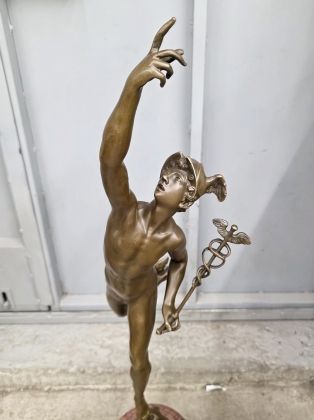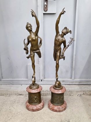 Крупные (88см; 22кг) парные скульптуры Меркурия и Фортуны, выполненные по моделям известного итальянского скульптора 16века Джованни да Болонья. Они изготовлены из патинированной бронзы с основаниями из красного мрамора.