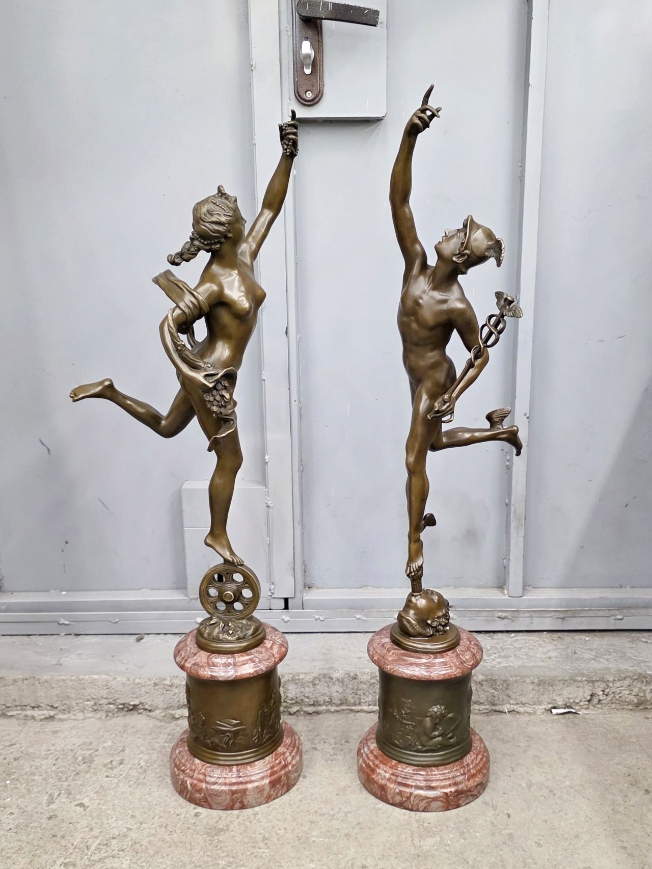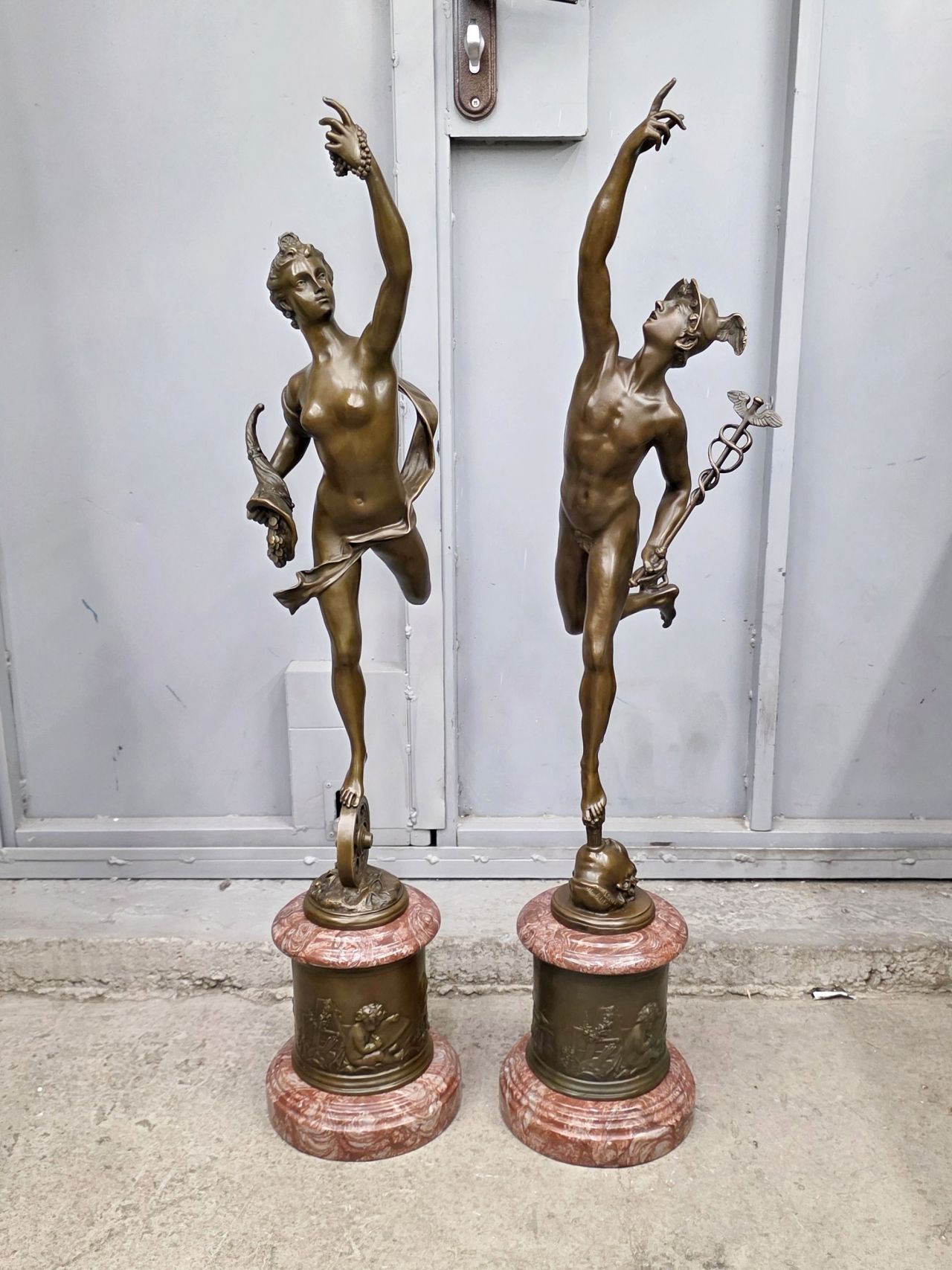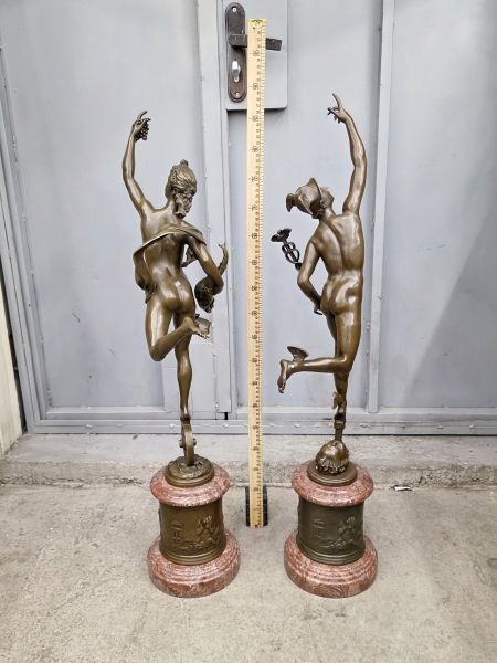 Крупные (88см; 22кг) парные скульптуры Меркурия и Фортуны, выполненные по моделям известного итальянского скульптора 16века Джованни да Болонья. Они изготовлены из патинированной бронзы с основаниями из красного мрамора.
