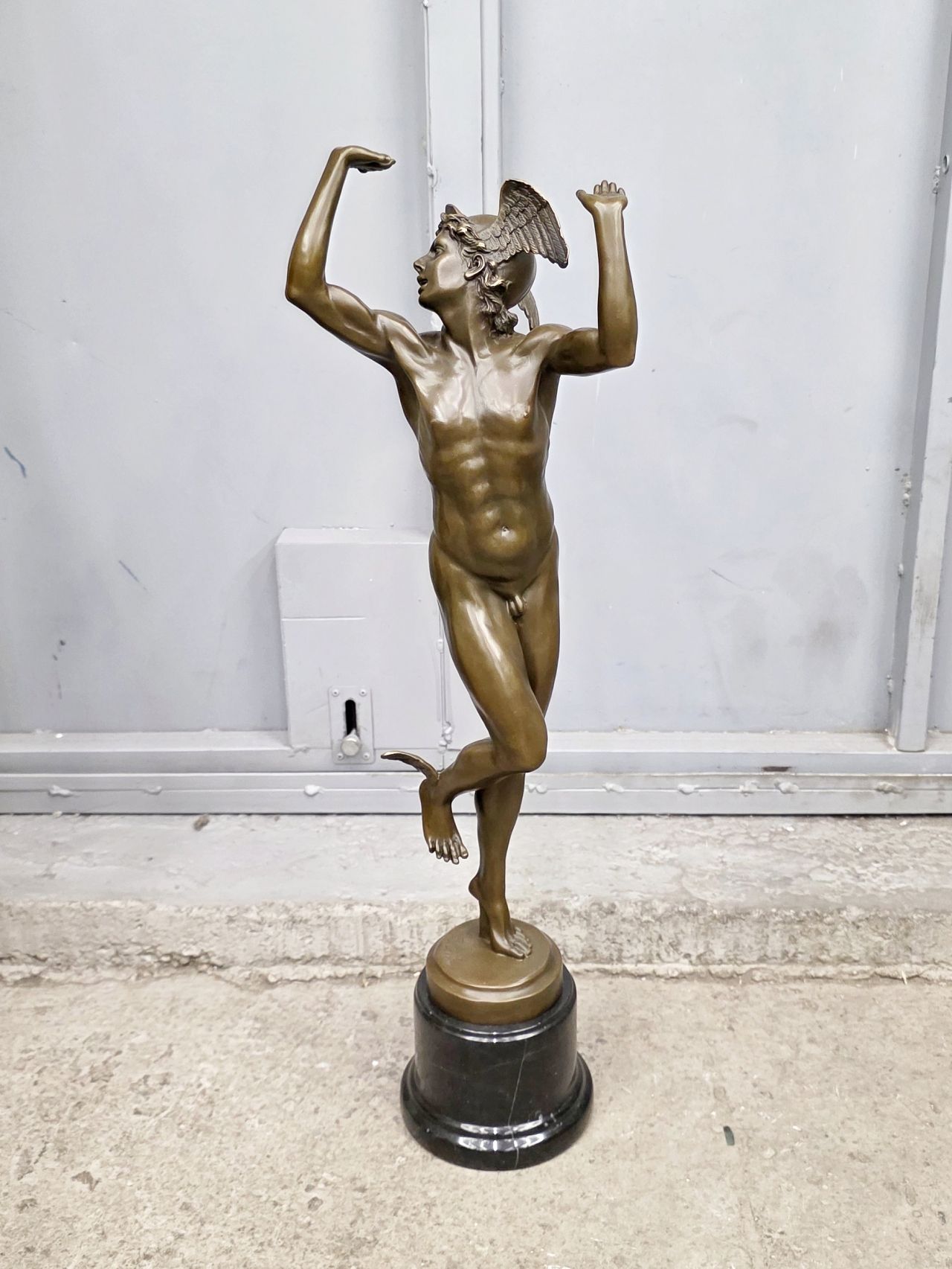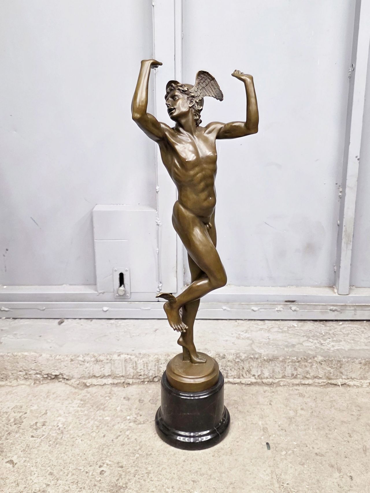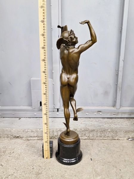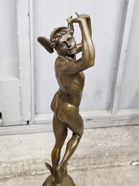 Автор изображает Меркурия в легком движении наподобие ритуальной пляски. Молодой бог здесь словно пританцовывает, празднуя очередную свою победу. Однако заложен и другой смысл — «летучий» бог едва коснулся земли. И эта поза, достаточно сложная для балансировки бронзовой фигуры, легко удалась виртуозу-ваятелю.