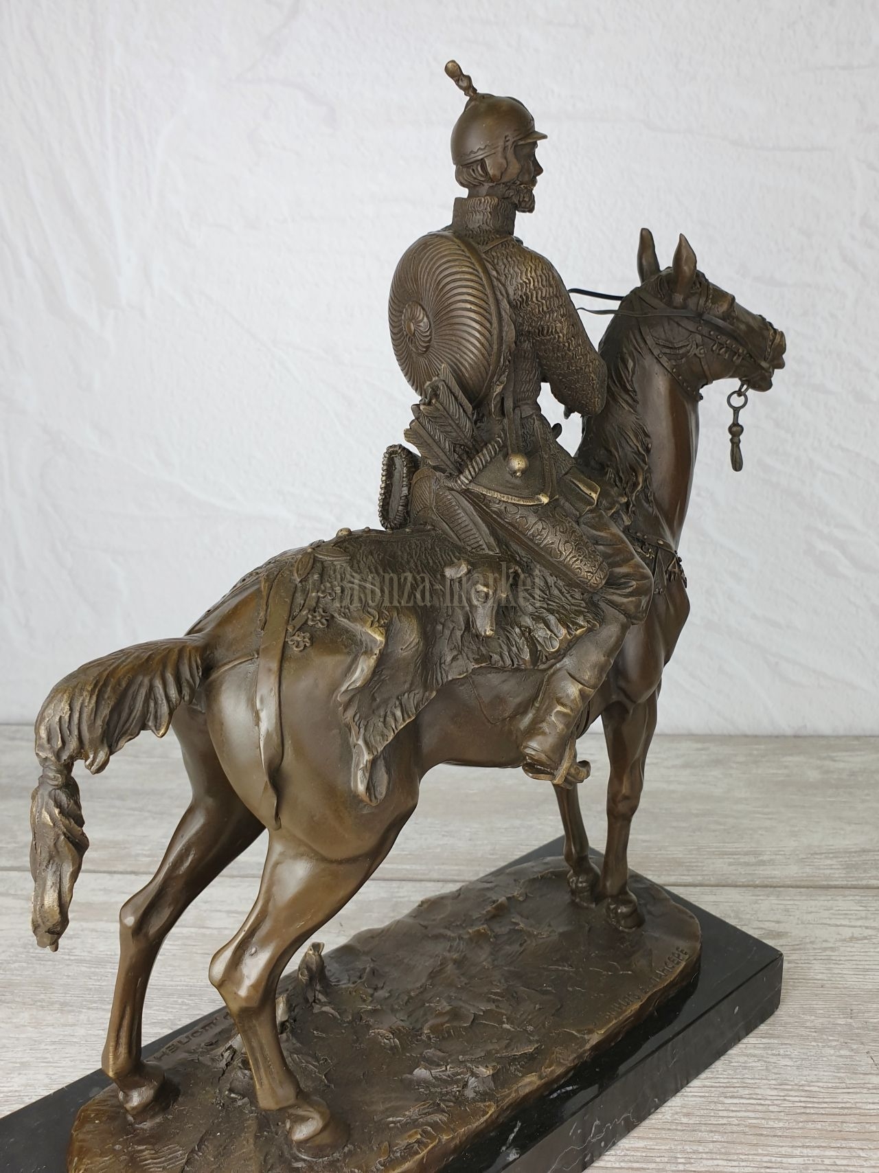 Вдоль кромки в литье подпись скульптора: " ЛЪПИЛЪ Е.ЛАНСЕРЕ"; вдоль задней кромки - штамп литейщика: "Ф.ШОПЕНЪ" Скульптура кабинетная "Молодой опричник (Князь Вяземский)" изображает русского воина в кольчуге, с колчаном, щитом и мечом, сидящего в высоком седле на богато украшенном коне. Под седлом шкура барса, к седле приторочена голова собака - символ опричника, который как пес выгрызает измену, будучи по-собачьи предан царю.