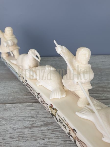 Традиционный сюжет. Сцена охоты чукчей на моржей. Девять костяных фигур, вырезанных с предельной точностью и детализацией. Мелкие элементы фигурок: длинные и тонкие копья охотников, моржи с большими бивнями, лица людей и морды животных. При своём кажущемся минимализме, скульптурная композиция выглядит очень полной и сбалансированной.