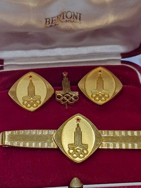Фрачник, брелок, запонки, зажим для галстука. Сделано в Италии (Милан). Фирма "Bertoni" - официальный изготовитель сувениров к Олимпиаде 80. Родные коробки.