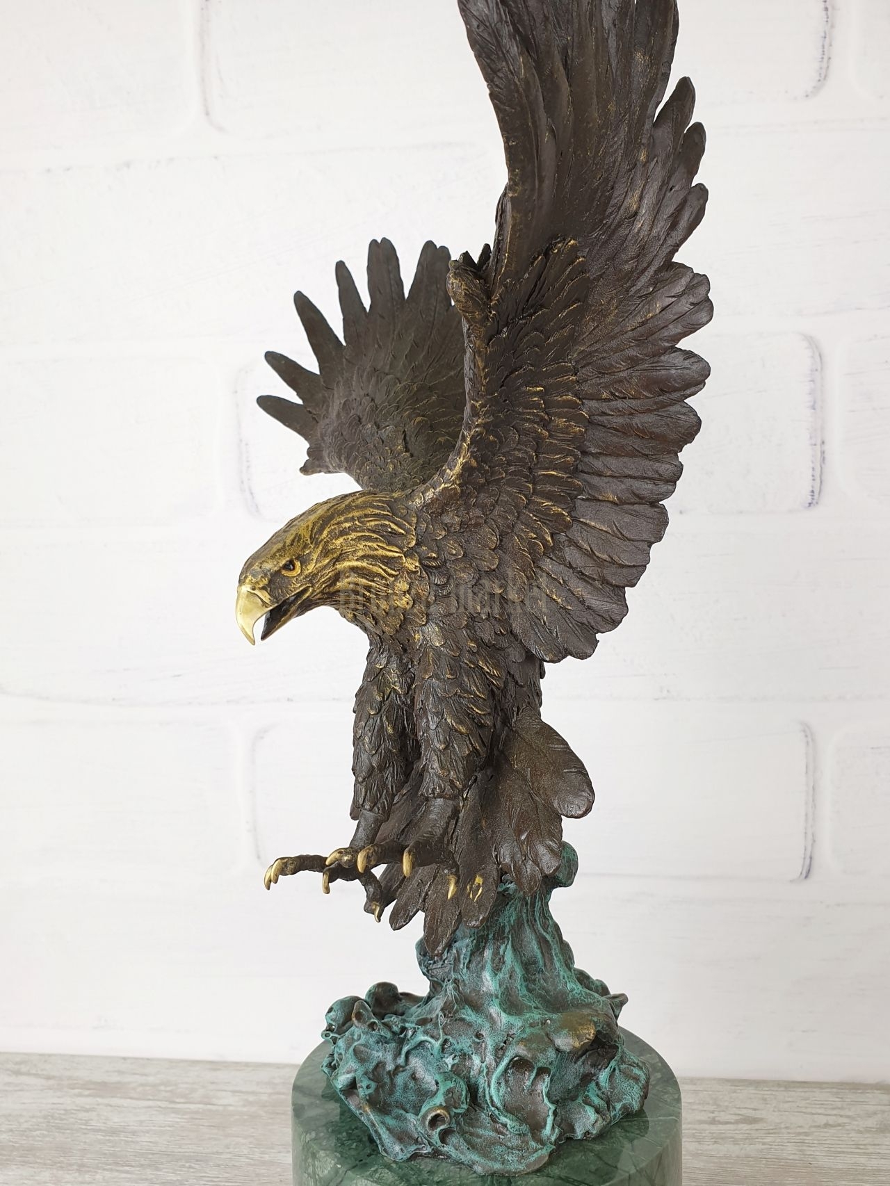 Качественная, интерьерная работа, выполненная руками европейских скульпторов. Установлена на зелёный мрамор. Отмечаем предельное внимание автора к каждому сантиметру работы, в мельчайших подробностях прописан каждый элемент птицы.