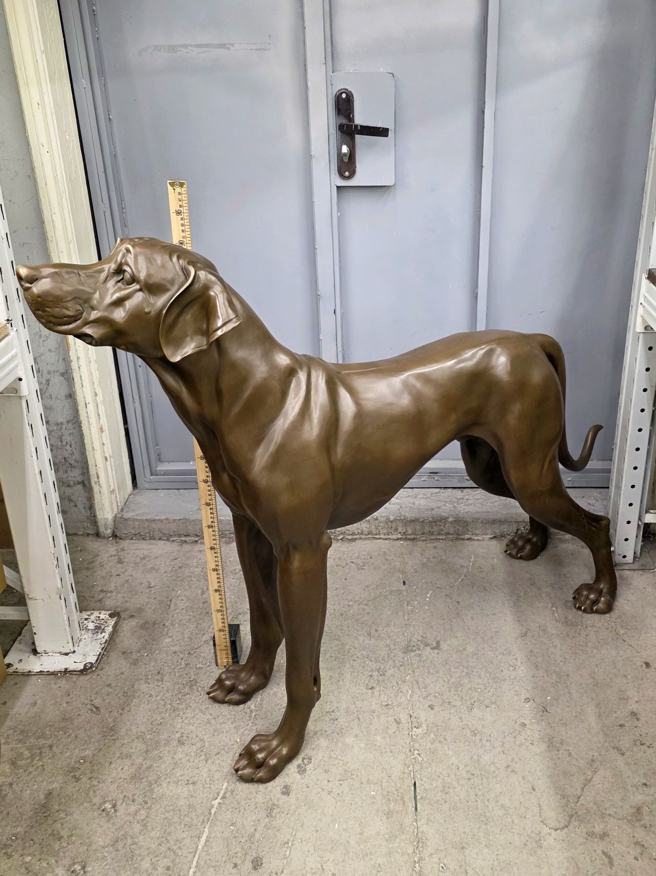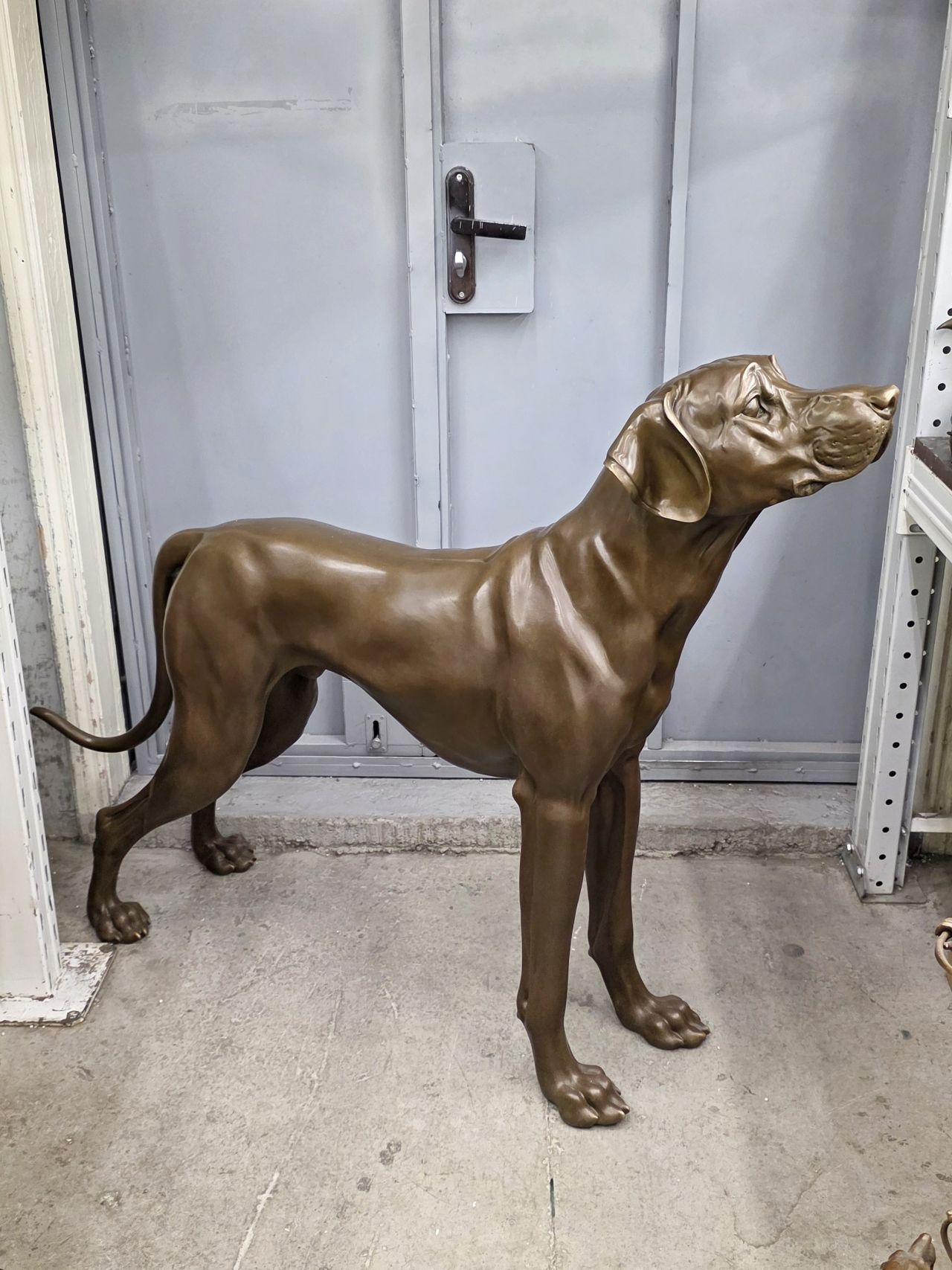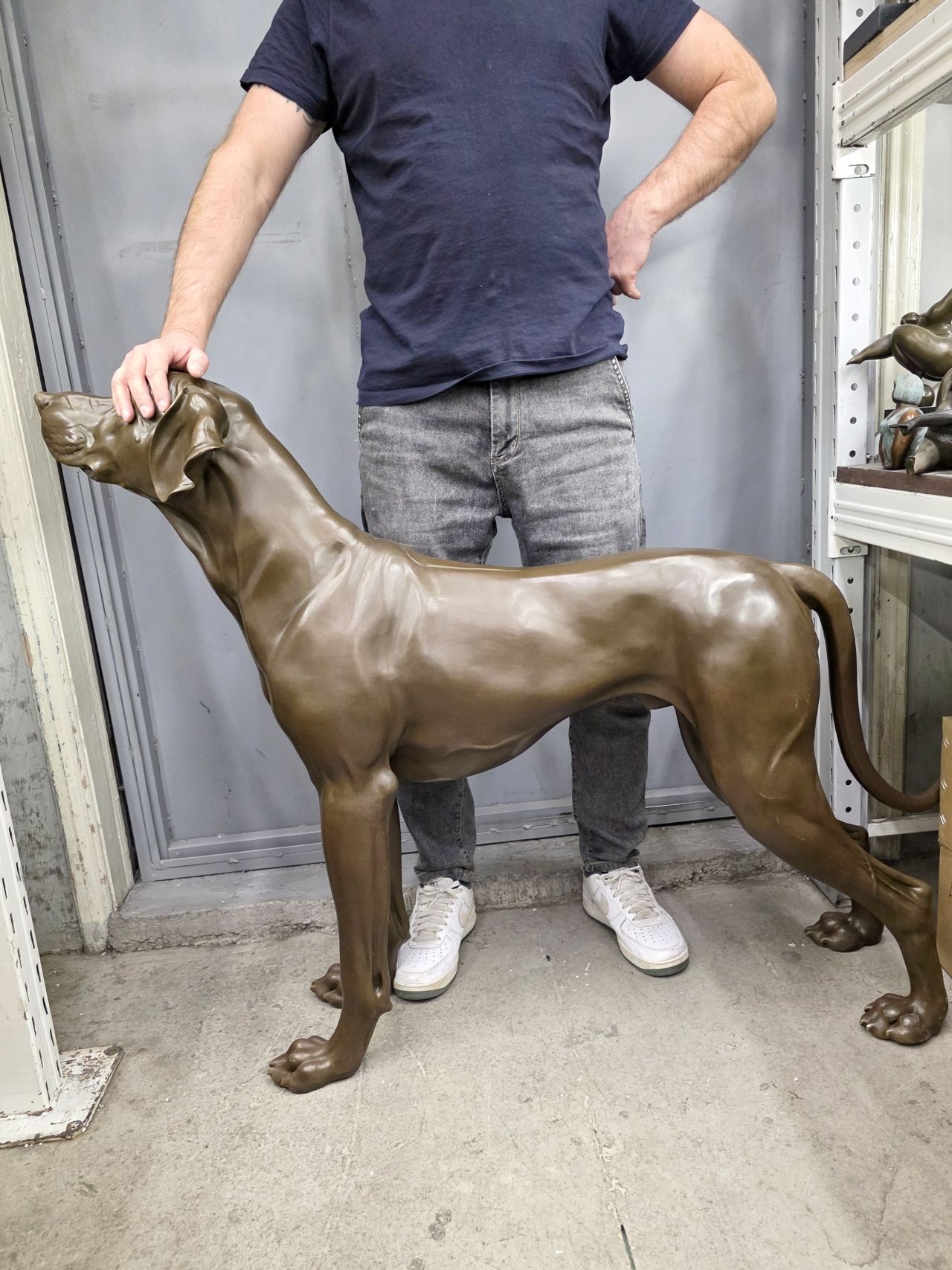 Представляем очень большую и тяжёлую (1,16м в длину, 38кг чистой бронзы) садовую скульптуру. Такая собака будет отлично смотреться на свежем воздухе, в саду или парковой зоне. Скульптура, исполненная на высочайшем уровне, мастерски передает характерные анатомические особенности породы, пропорции кажутся идеальными.