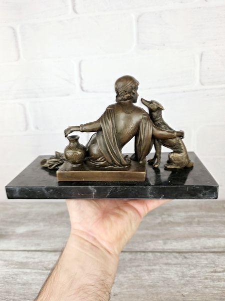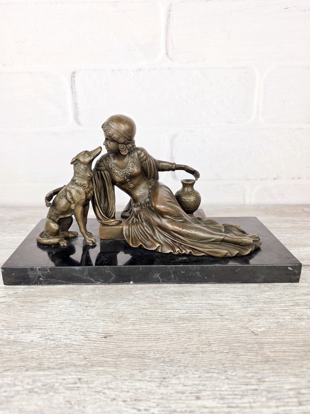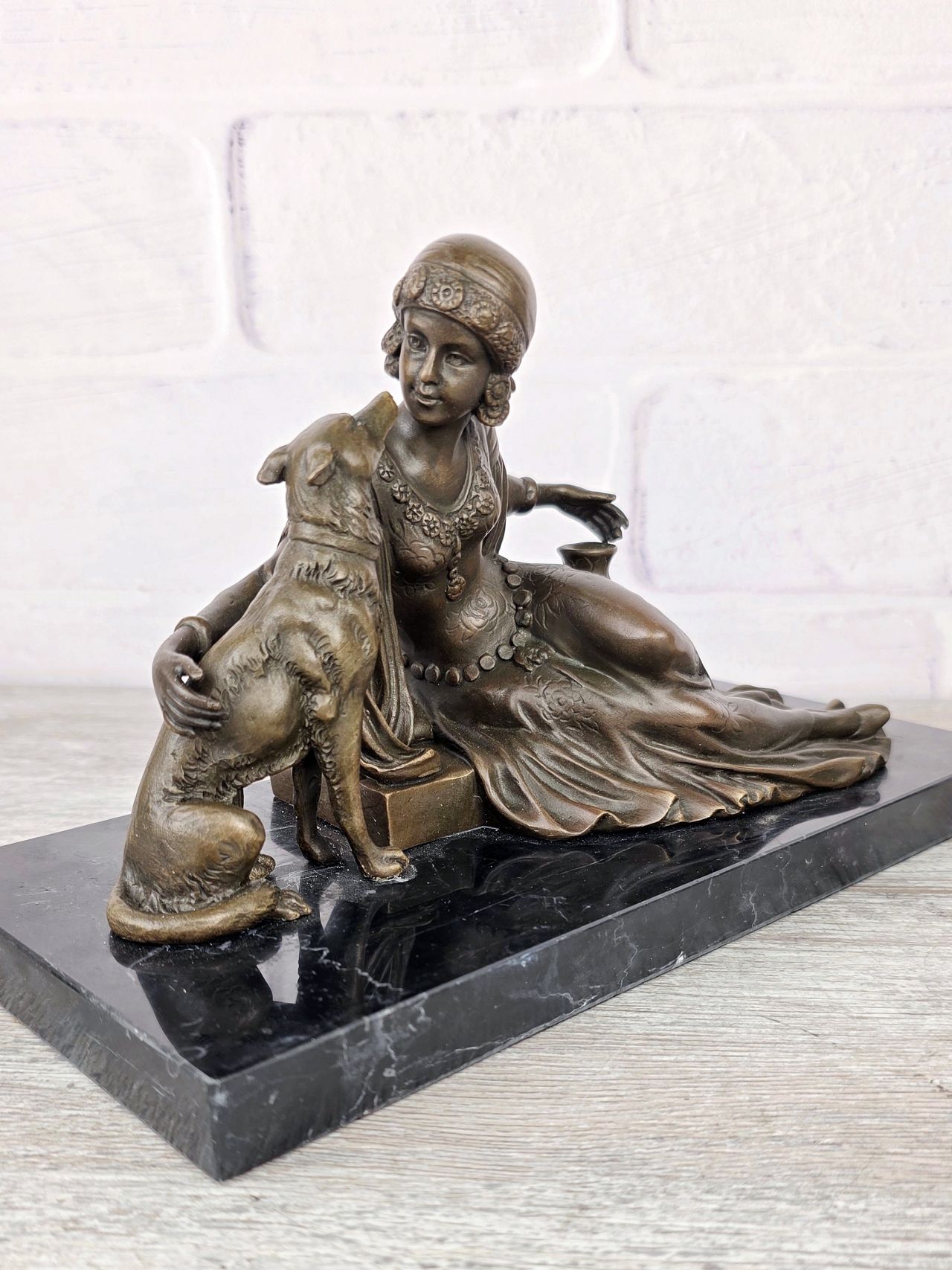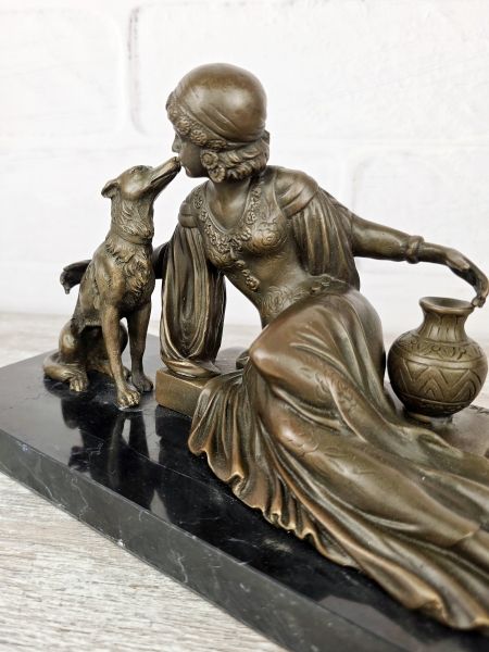Скульптура средних размеров (27см в ширину; 3,1 кг), изображает сидящую женщину в изысканной одежде и головном уборе, которая нежно обращается к собаке, стоящей рядом. Подобные работы были популярны в 1920-х и 1930-х годах.