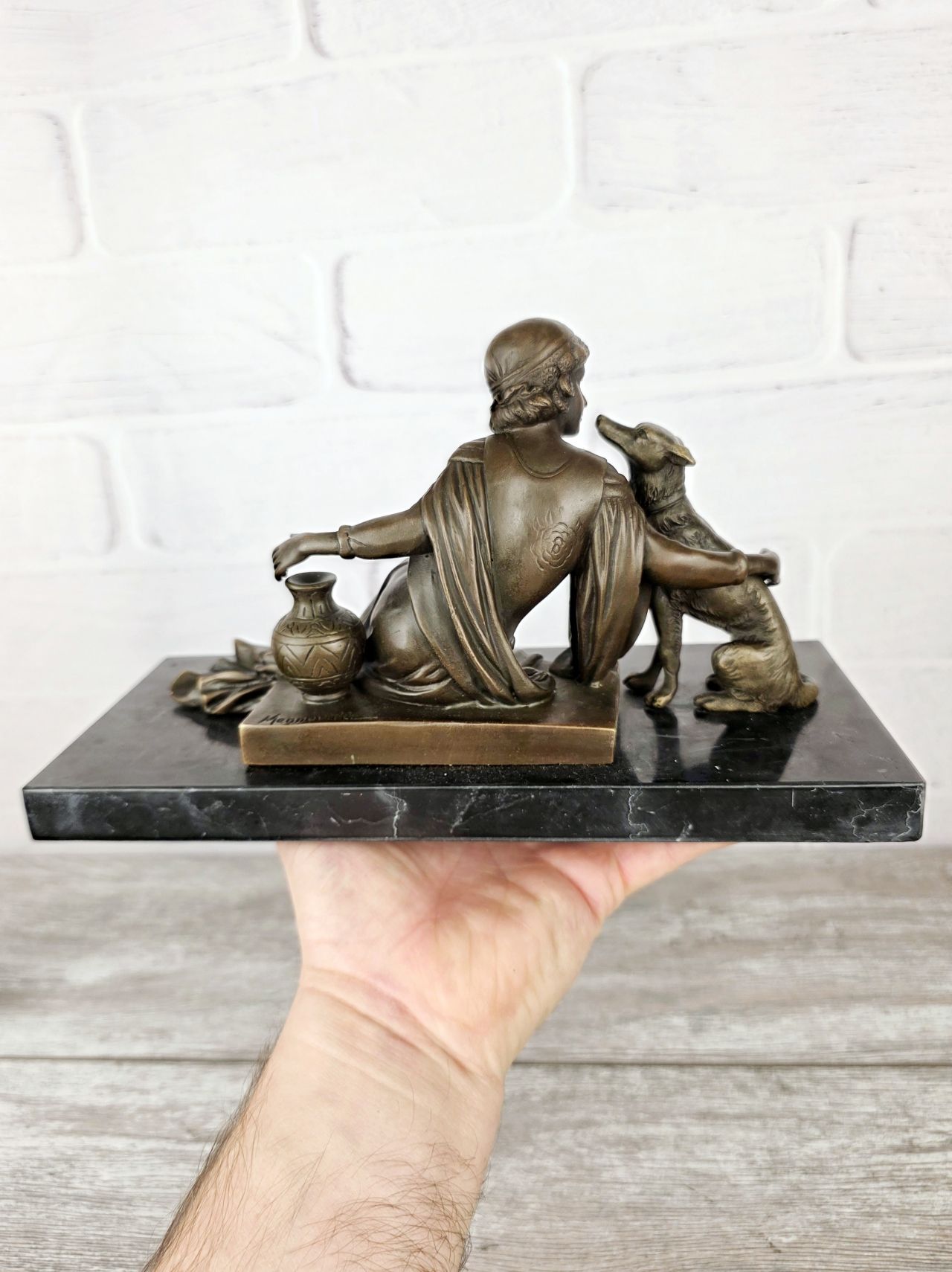 Произведение «Девушка и борзая» выполнена по модели французского скульптора в характерном для арт-деко стиле, сочетающем элегантность, театральность и реалистичную трактовку фигур.