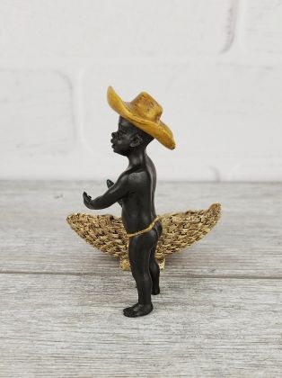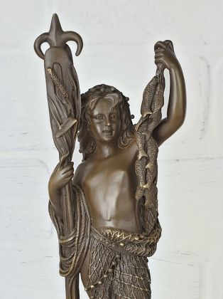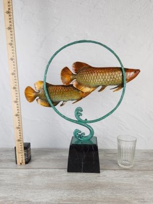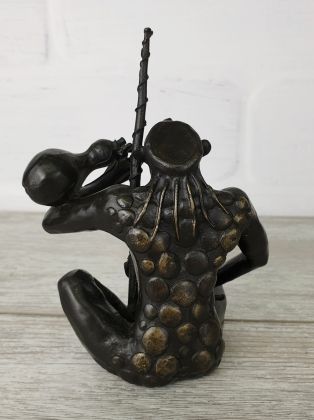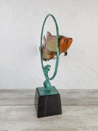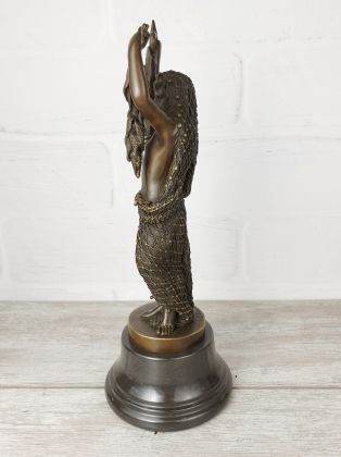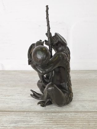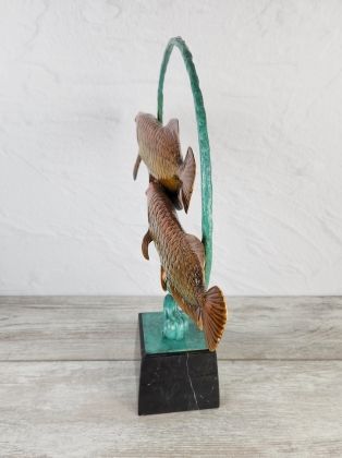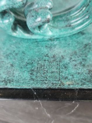 Скульптура частично покрыта зелёной патиной, что придаёт ей яркий, декоративный эффект.