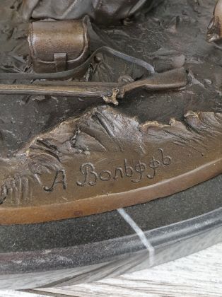 Жюль Муанье (Jules Moignez)(1835-1894) - известный французский скульптор-анималист. Муанье изучал скульптуру под руководством известного мастера Поля Комольера (школа Франсуа Рюда) в Париже. В течение своей 40-летней скульптурной карьеры Муанье выставил более тридцати работ на Салоне между 1855-92. Отец Муанье был известным мастером-позолотчиком, со временем купил литейную мастерскую, что стало весьма полезным для Жюля, так как у него не было дополнительных затрат при отливке своих работ.