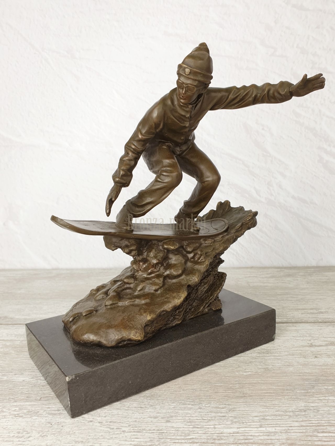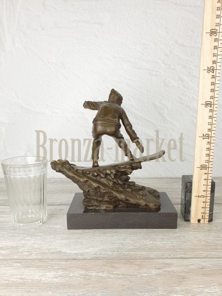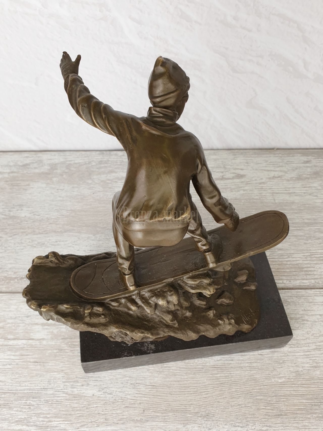 Качественная работа европейского скульптора, изображающая сноубордиста. Автор умело передаёт динамику момента прохождения спуска, поза сноубордиста естественна, реалистична. Обращает на себя внимание предельное внимание к каждому сантиметру работы, в мельчайших подробностях переданы детали одежды и обмундирования спортсмена.