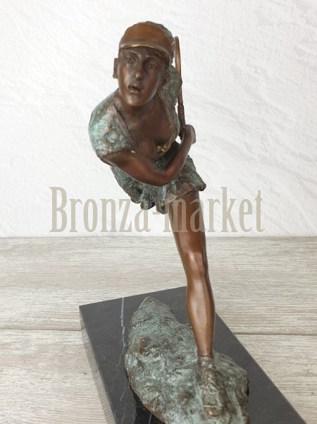Представляем авторскую работу, изображающую теннисистку. Исполненная на высочайшем уровне, скульптура в мельчайших подробностях передает анатомию тела спортсменки, напряжение мускул, эмоции на лице. Вручную покрыта зелёной патиной, что придаёт ей особую привлекательность.