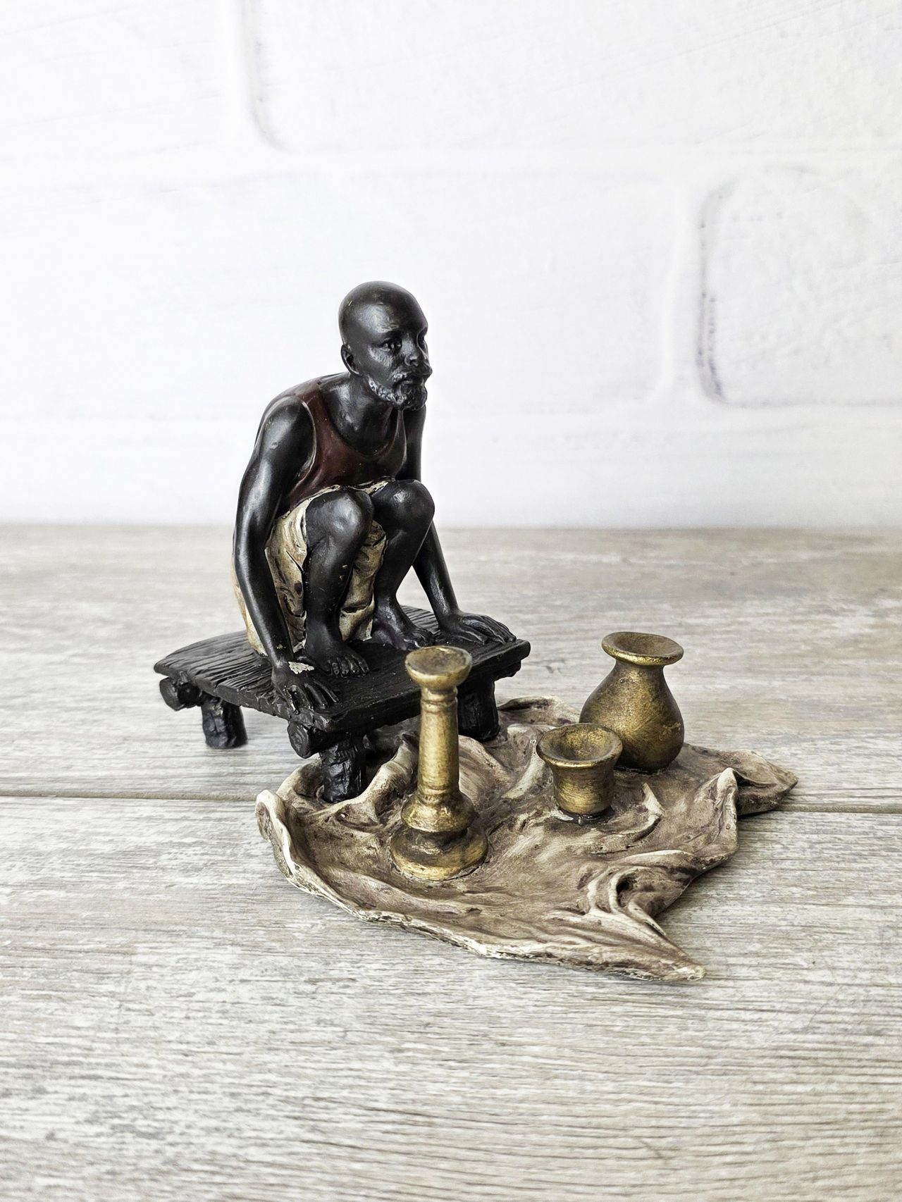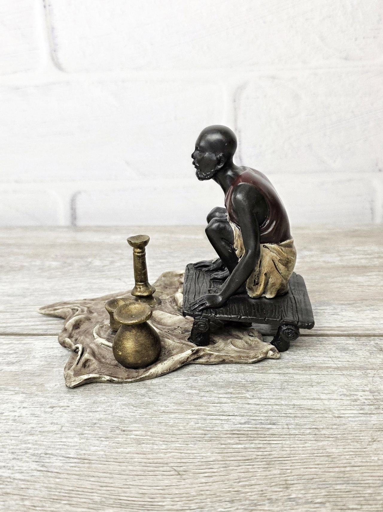 Представленная работа является характерным образцом венской декоративной бронзы начала XX века. Фигурка изображает сидящего восточного торговца, который демонстрирует свои товары - два горшка и высокий сосуд на лотке или ковре. Статуэтка состоит из двух собирающихся воедино частей.