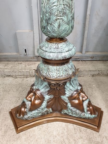 Крупные (1,1 метр в высоту, почти 23кг), выполненые целиком из бронзы, наши стойки по настоящему впечатляют. Основание стойки представляет собой три одинаковых лика сказочного, античного персонажа, немного страшного, но скорее величественного. Особое внимание направлено на мельчайшую детализацию сложного, завораживающего орнамента, украшающего стойку по всей длине. Часть стойки покрыта зелёной патиной, что придаёт ей особую привлекательность.