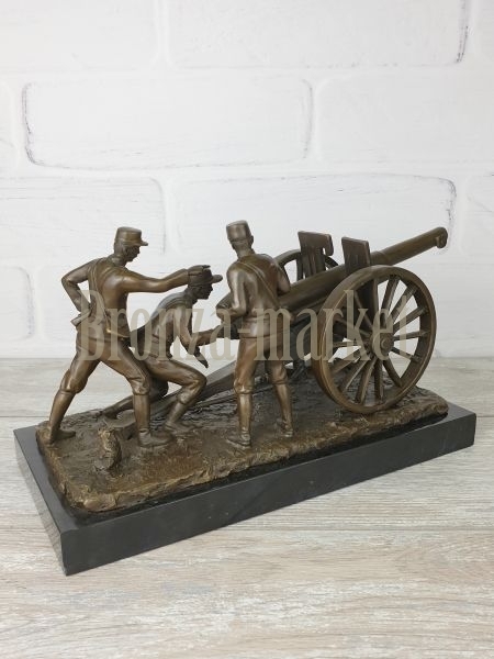Авторская бронзовая скульптура, изображающая сцену военных действий. Офицер с орденом Почётного легиона на груди и двое солдат-артиллеристов ведут огонь из орудия по отступающему врагу. Скульптура крупная и тяжёлая (40см, 11,1кг), хороший подарок офицеру или любителю военной истории