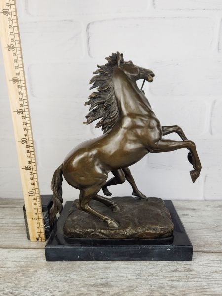 Всадник, укрощающий коня - популярный сюжет. Вариации на эту тему ныне украшают Париж, Санкт-Петербург (Аничков мост), Вашингтон. Данное произведение - уменьшенная копия парных скульптур, украшающих Париж. Парные скульптуры "Укротители коней" были сделаны специально для дворца в Марли. Позднее они были установлены на площади Согласия в Париже перед входом на Елисейские поля. В 1984 г. их заменили на копии, в то время как оригиналы отправились в Лувр, где и находятся по сей день. Бурный порыв, характерный для барокко, сочетается здесь с укрощённым стремлением, что наполняет группу ощущением драматизма. Силуэт выверен и четок: вздыбленные крупы коней, развевающиеся гривы придают ему декоративную живописность, красоту, ощущение полета.
