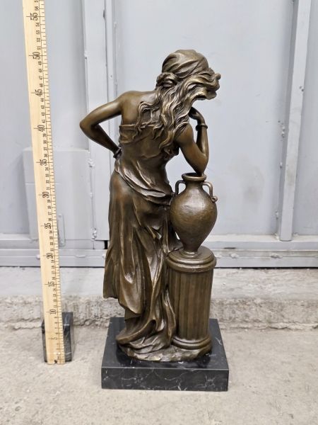 Представленная скульптура является репродукцией известного французского скульптора, которая часто встречается названиями вроде «Викторианская девушка с кувшином» или «Викторианская леди, обдумывающая что-то, прислонившись к вазе».