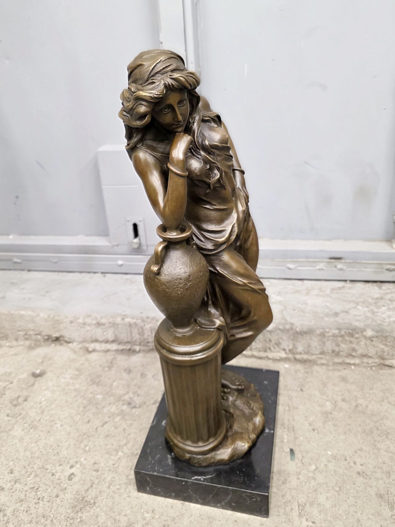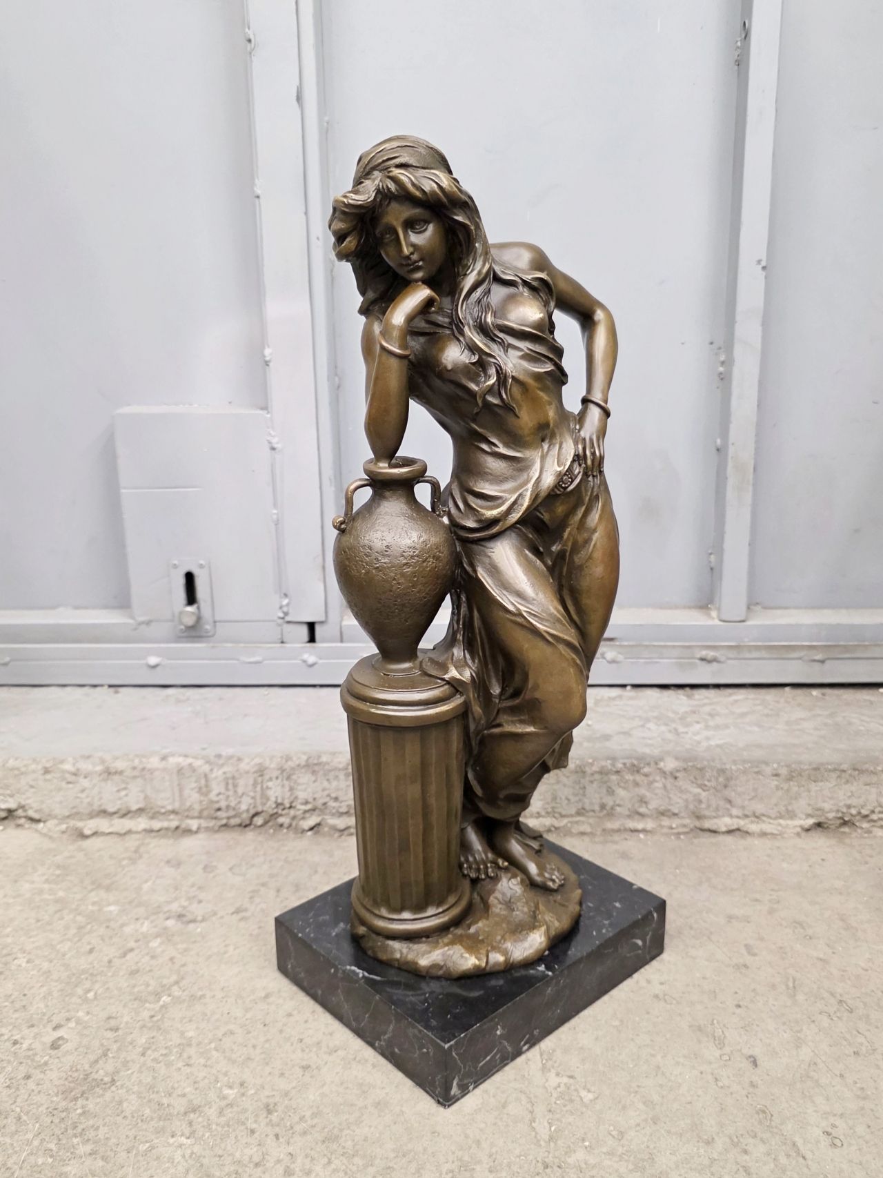 Представленная скульптура является репродукцией известного французского скульптора, которая часто встречается названиями вроде «Викторианская девушка с кувшином» или «Викторианская леди, обдумывающая что-то, прислонившись к вазе».