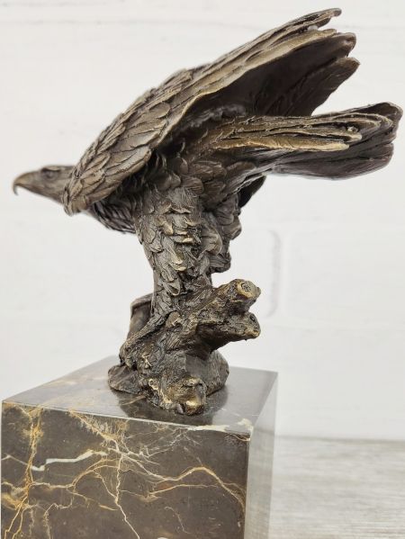 Качественная работа, изображающая ястреба. Установлена на мрамор. Отмечаем предельное внимание автора к каждому сантиметру работы, в мельчайших подробностях прописана структура оперения.
