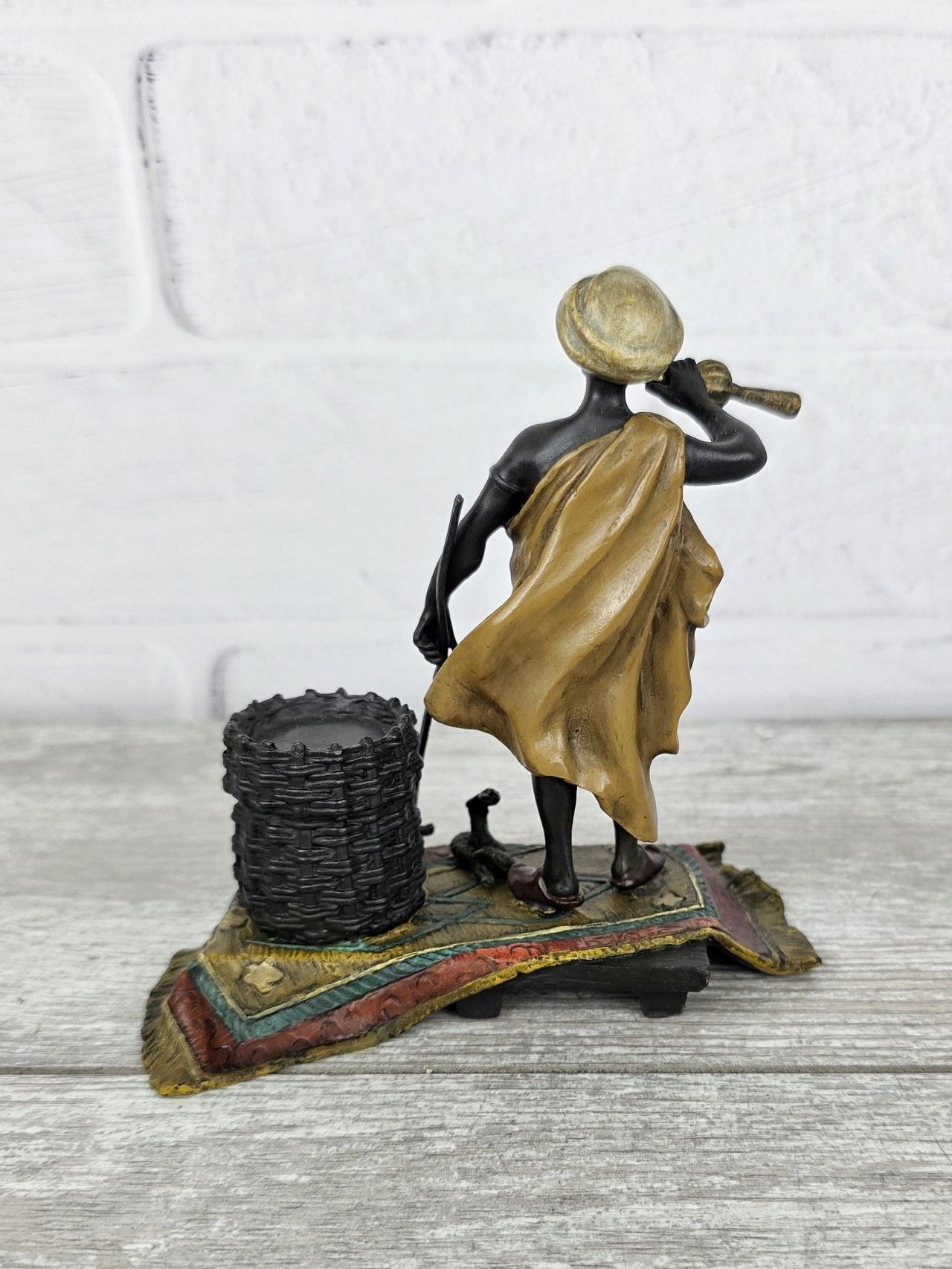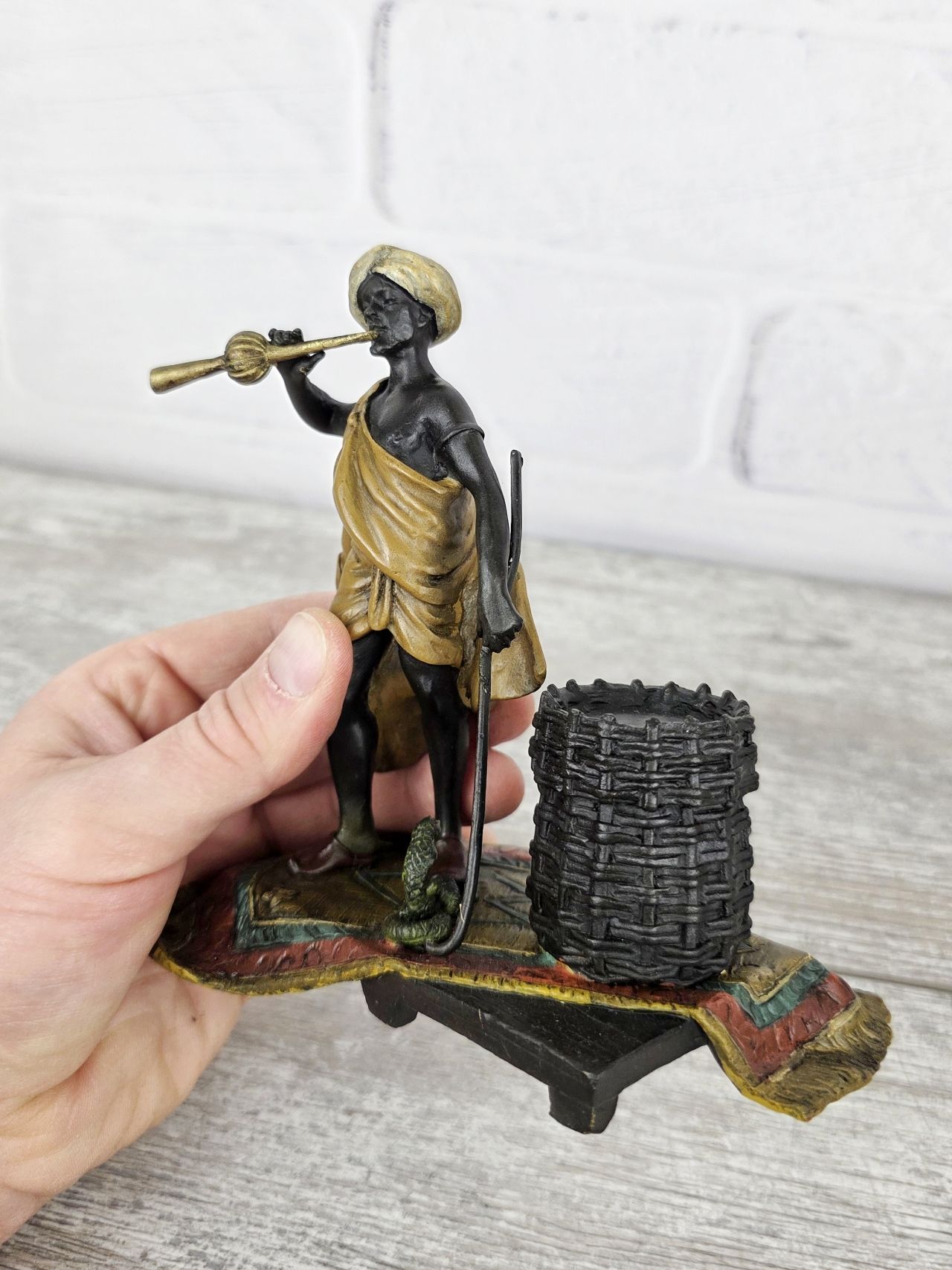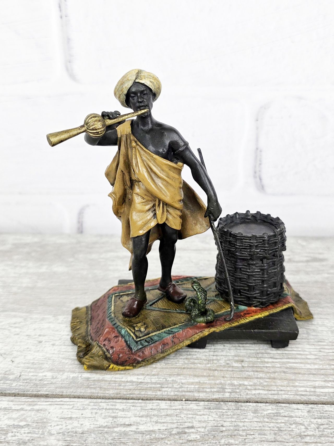 Представленная работа является характерным образцом венской декоративной бронзы начала XX века. Фигурка изображает заклинателя змей, играющего на флейте перед коброй, которая поднимается из плетёной корзины. Достаточно популярная композиция в востоковедческом искусстве того времени.