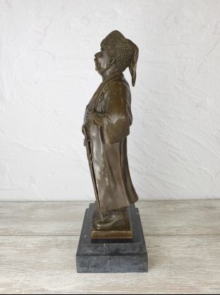 Скульптор воспроизвёл в бронзе Тараса Бульбу - самого хрестоматийного персонажа картины И.Репина "Казаки пишут письмо турецкому султану"Напс Евгений (Эжен-Иоган) (II половина XIX-начало XX вв.) Скульптор-самоучка, реставратор, рисовальщик и живописец. Из семьи прибалтийских немцев. Работал в Санкт-Петербурге. Занимался реставрацией фарфора, мелкой пластики и бронзовой скульптуры для антикваров и коллекционеров. Все известные работы Напса свидетельствуют о его профессиональном владении бронзолитейным искусством. Существует версия, что под псевдонимом "Напс" работал Евгений Лансере. Работы Напса отливались на бронзовой фабрике Верфеля - конкурента мастерской Ф. Шопена, заключившего с Лансере кабальный договор на длительную перспективу (как оказалось потом - почти на всю жизнь скульптора), работать под своим именем с другими бронзолитейными мастерскими Лансере не мог.